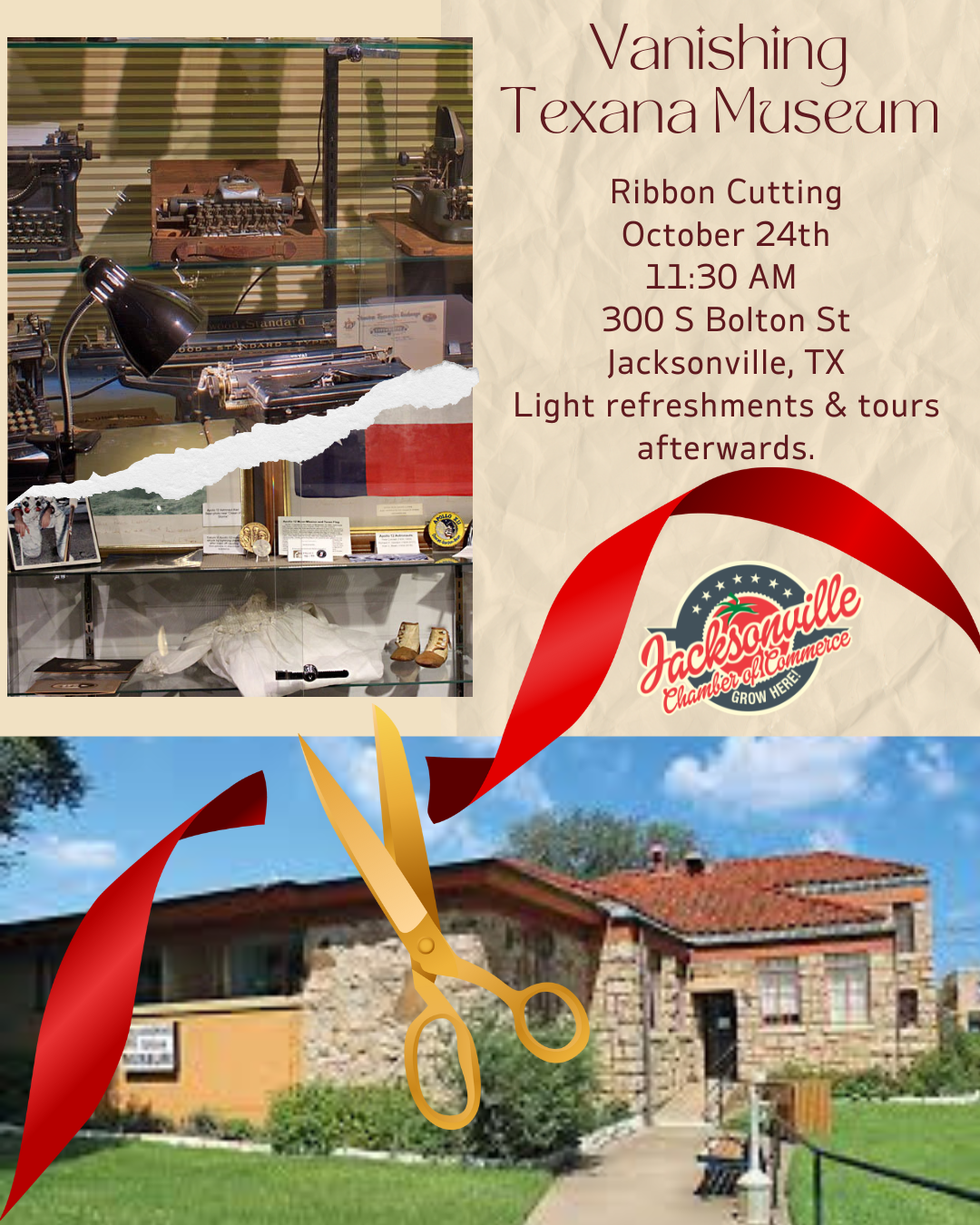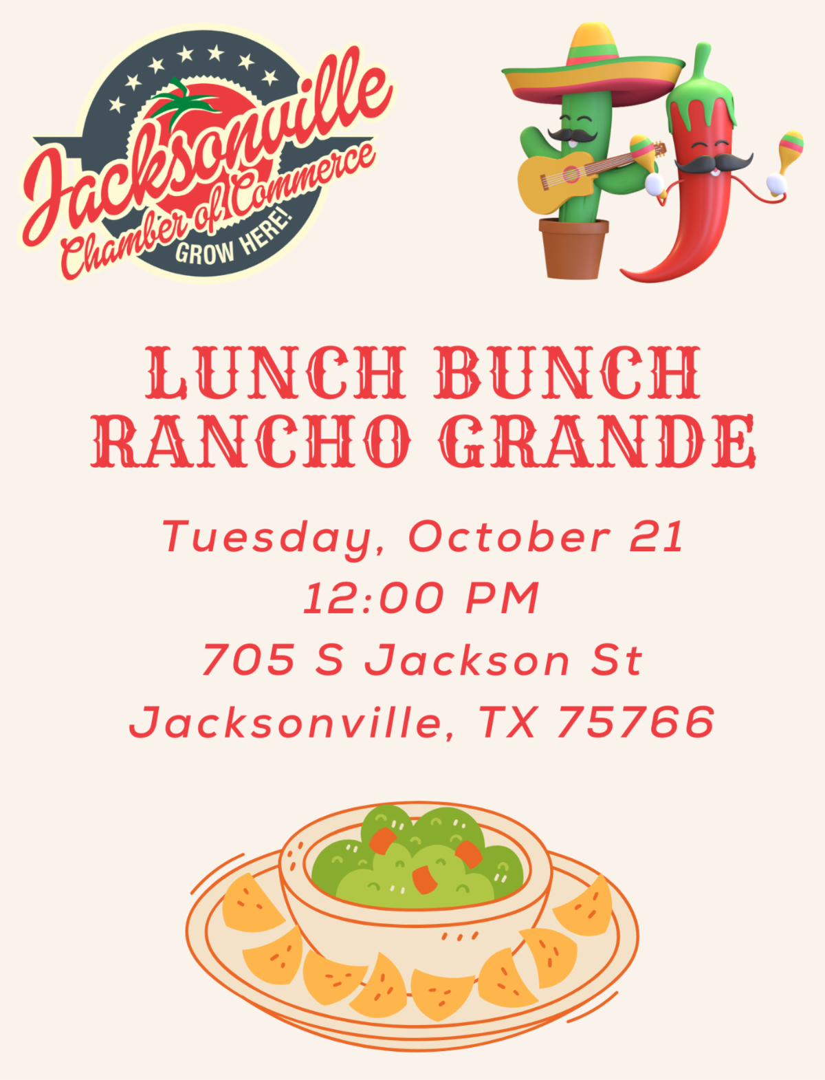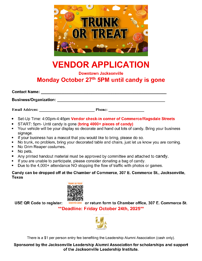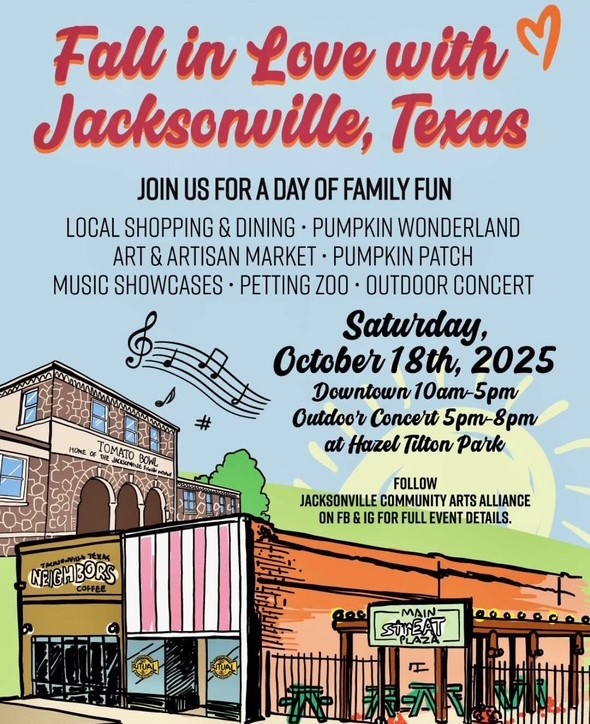 For details contact: Jacksonville Chamber of Commerce, 903.586.2217 or peggy@JacksonvilleTexas.com.