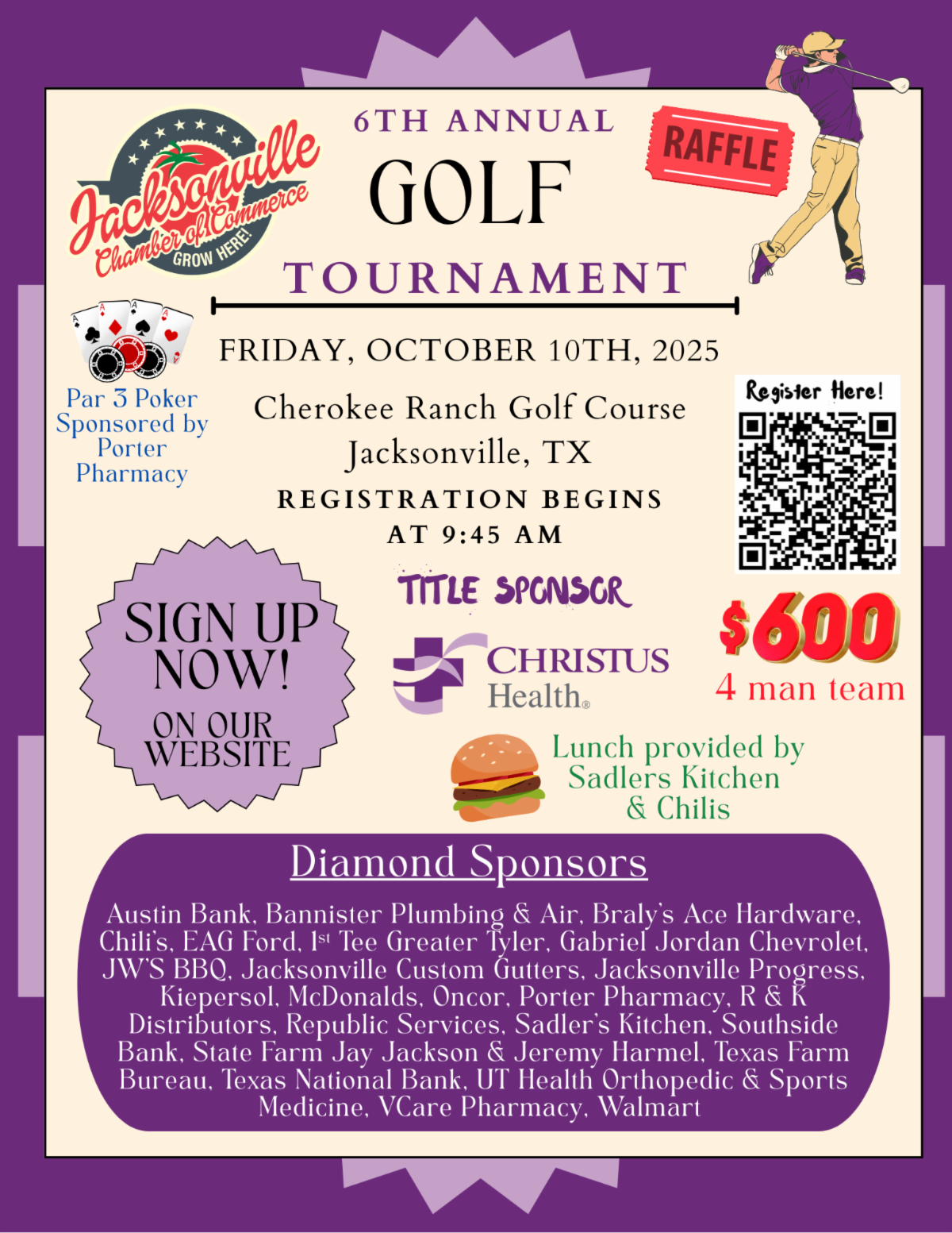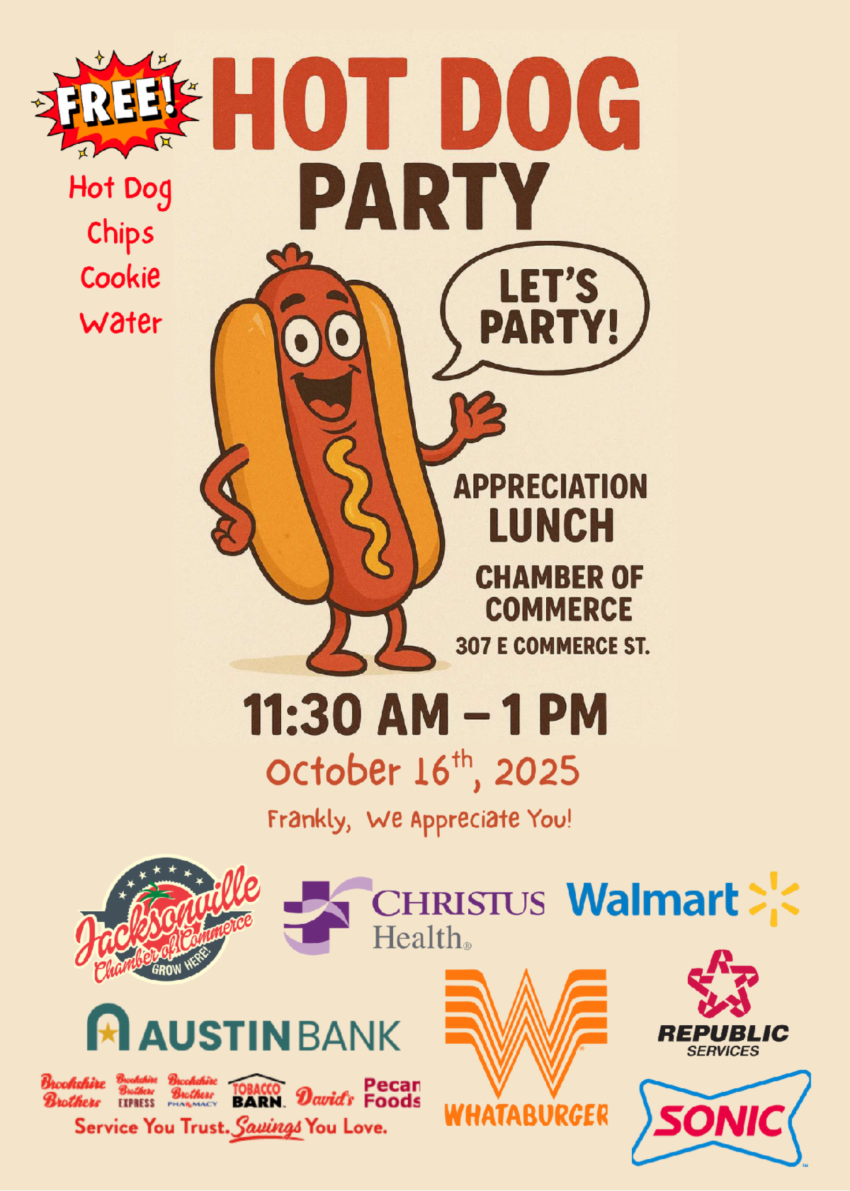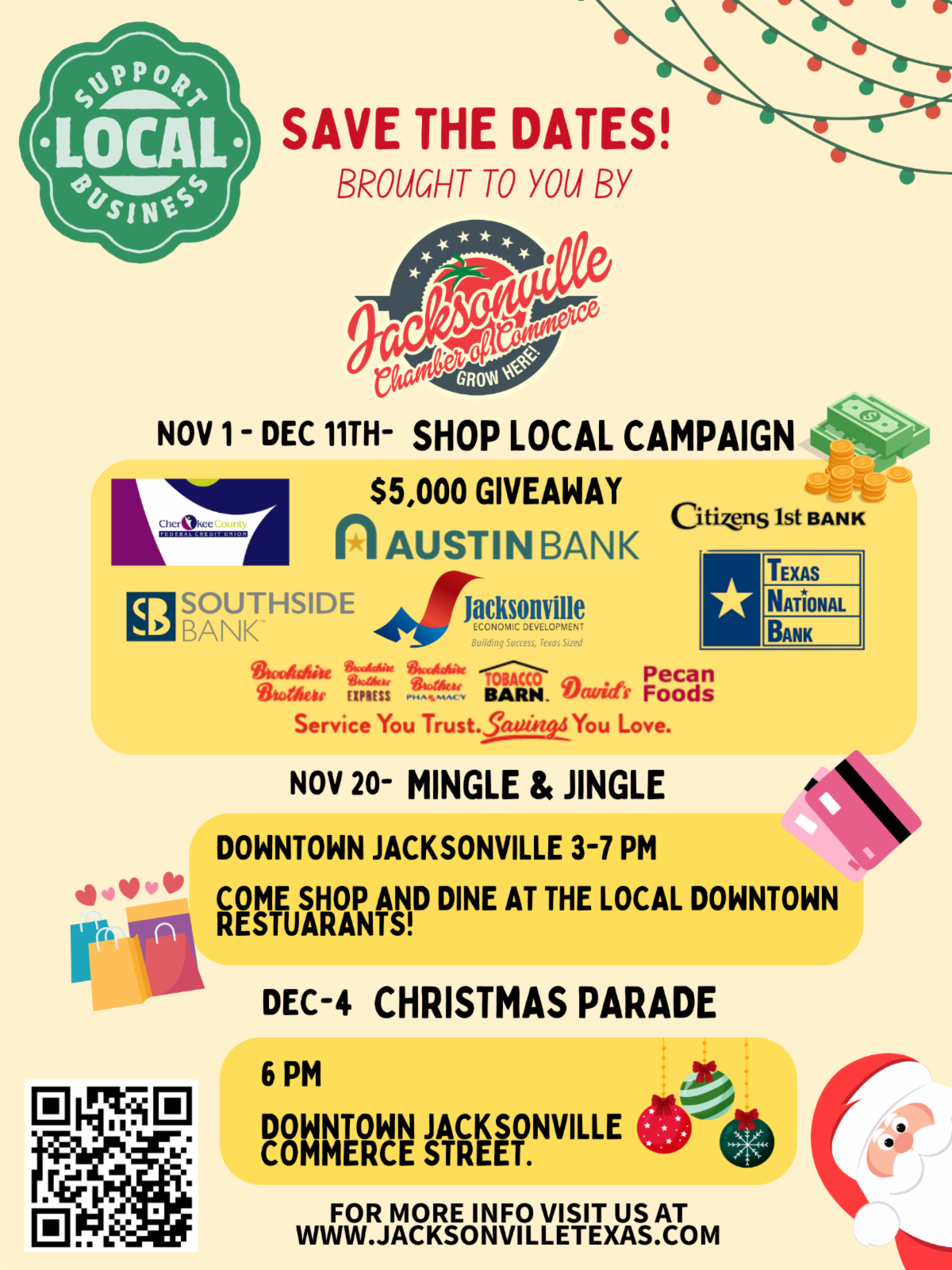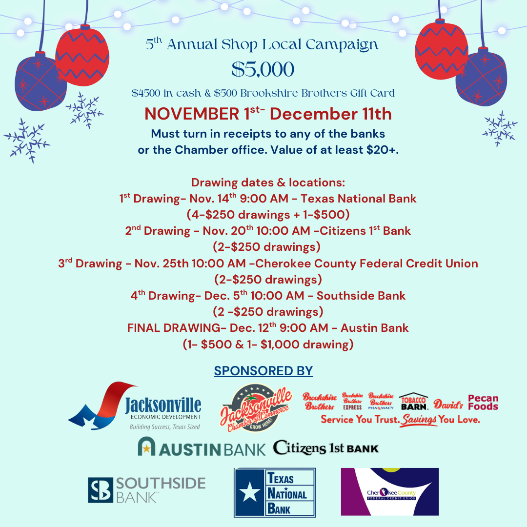 Sponsored by Austin Bank, Citizens 1st Bank, Cherokee County Federal Credit Union, Jacksonville Chamber of Commerce, Jacksonville Economic Development Corporation, Southside Bank and Texas National Bank.