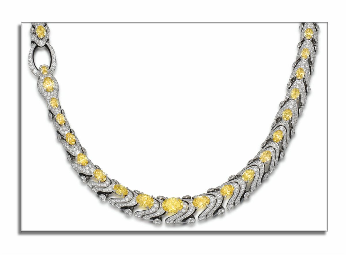 Seen here: Cartier necklace set with 25 oval brilliant cut diamonds, all Fancy Vivid Yellow or Fancy Vivid Orangy Yellow, all with GIA reports! WOW!