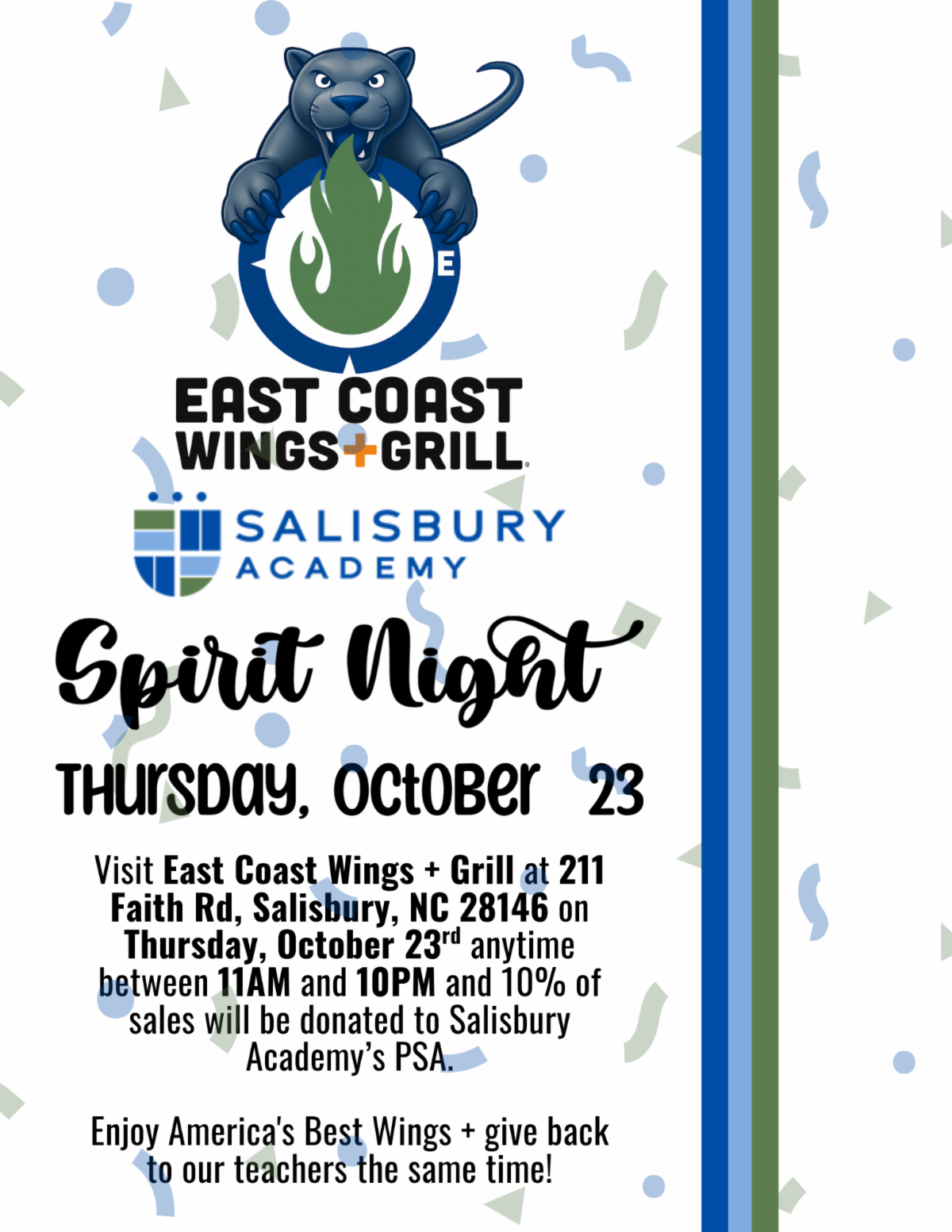 *SA Spirit Night at East Coast Wings, 11 a.m. to 10 p.m. Mention SA to have 10% of sales donated to the PSA!