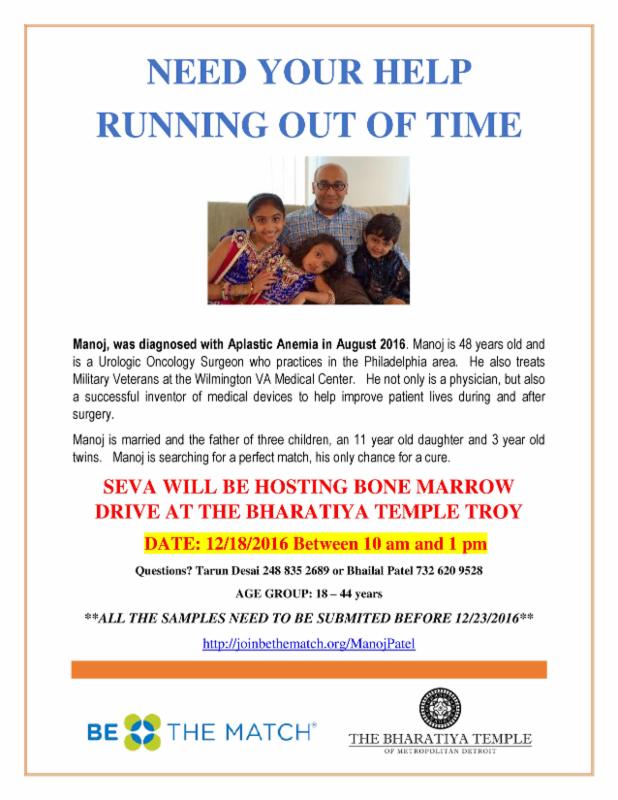 Your Seva Bharatiya Temple Troy is participating in a nationwide search for a Bone Marrow match to save Manoj, who is himself a physician. Please drop by at Bharatiya Temple Troy on Sunday, Dec 18th for Bone Marrow Drive. For more details on Bone Marrow and how you can save, please visit