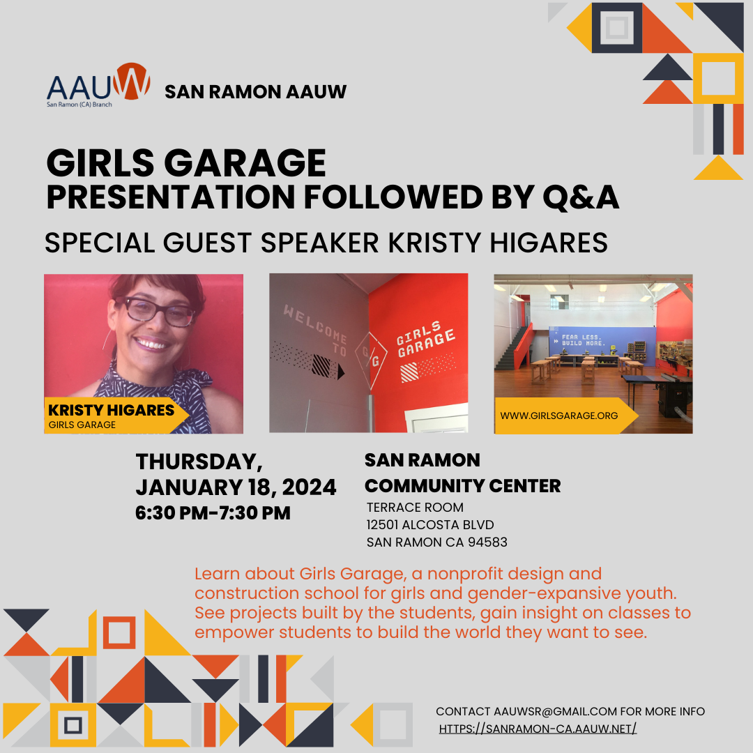 Also on January 18th, the San Ramon AAUW is hosting "Girls Garage" a non-profit design and construction school, at the San Ramon Community Center.