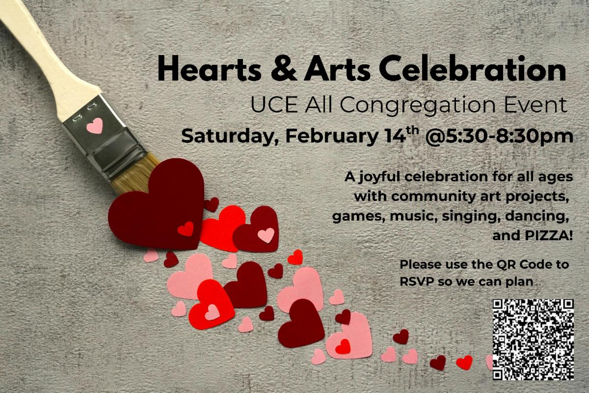This Valentines Day, the whole UCE community is invited to come together for fun, food, and creative expression. All ages are welcome with lots of ways to participate. We’re re-imagining "Night of the Arts" with pizza, singing, dancing, games and kinship. The fun starts at 5:30. Dinner will be available at 6:30 followed by music, singing, and dancing until 8:30. Nursery care will be available during games and artmaking events before and after dinner. Look for the Signup.com QR code on the Hearts & Arts poster at UCE to register. If you are available to help, please use Signup.com.