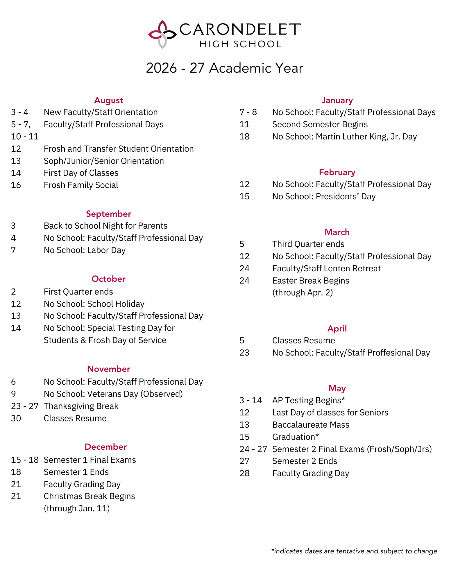“Year at a Glance” calendars for the next two school years, 2025-26 and 2026-27 are now available. These calendars include dates for the start and end of the year, school holidays, Faculty/Staff professional development (PD) days, select key events, and school breaks.