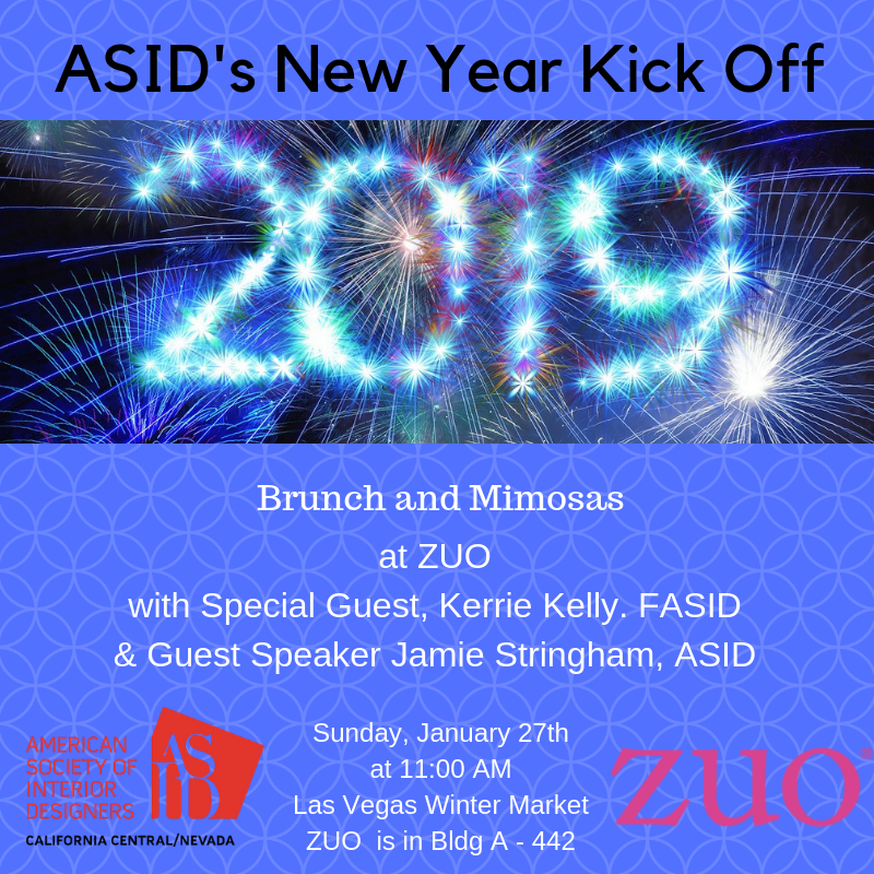 We are looking forward to all members joining us at our ASID's New Year's Launch Party and Brunch at ZUO on Sunday, January 27th at 11 AM. Zuo's Showroom is in Building A-442.