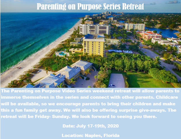 We are looking forward to hosting the Parenting on Purpose Video Series in a weekend retreat. It will be an opportunity for parents to immerse themselves in the series and connect with other parents. It will be hosted just a short drive away, so it's easy to get to. Childcare will be available so we encourage parents to bring their children and make this a fun family get away. We will also be offering surprise give-aways. The retreat will be Friday- Sunday. We look forward to seeing you there. More information coming soon.