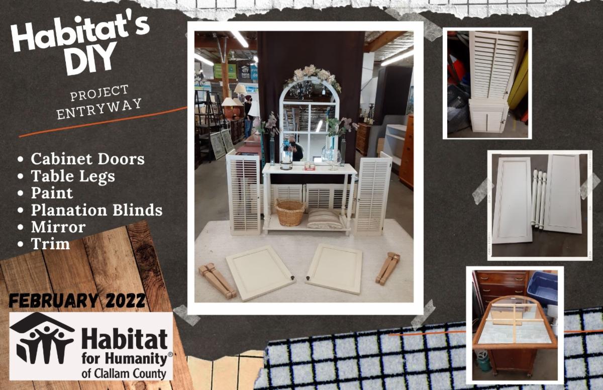All the items needed for this beautiful entryway table were found at the Port Angeles Habitat Store. With some paint and a little imagination, the possibilites are endless!