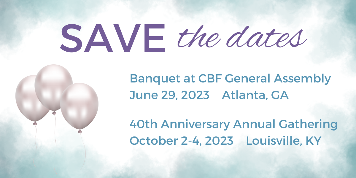 We are planning two special events as a part of our celebration. First, instead of hosting our annual gathering prior to the Cooperative Baptist Fellowship's General Assembly, we will have a banquet at the Hyatt Regency, Downtown Atlanta on Thursday evening, June 29, during CBF General Assembly.