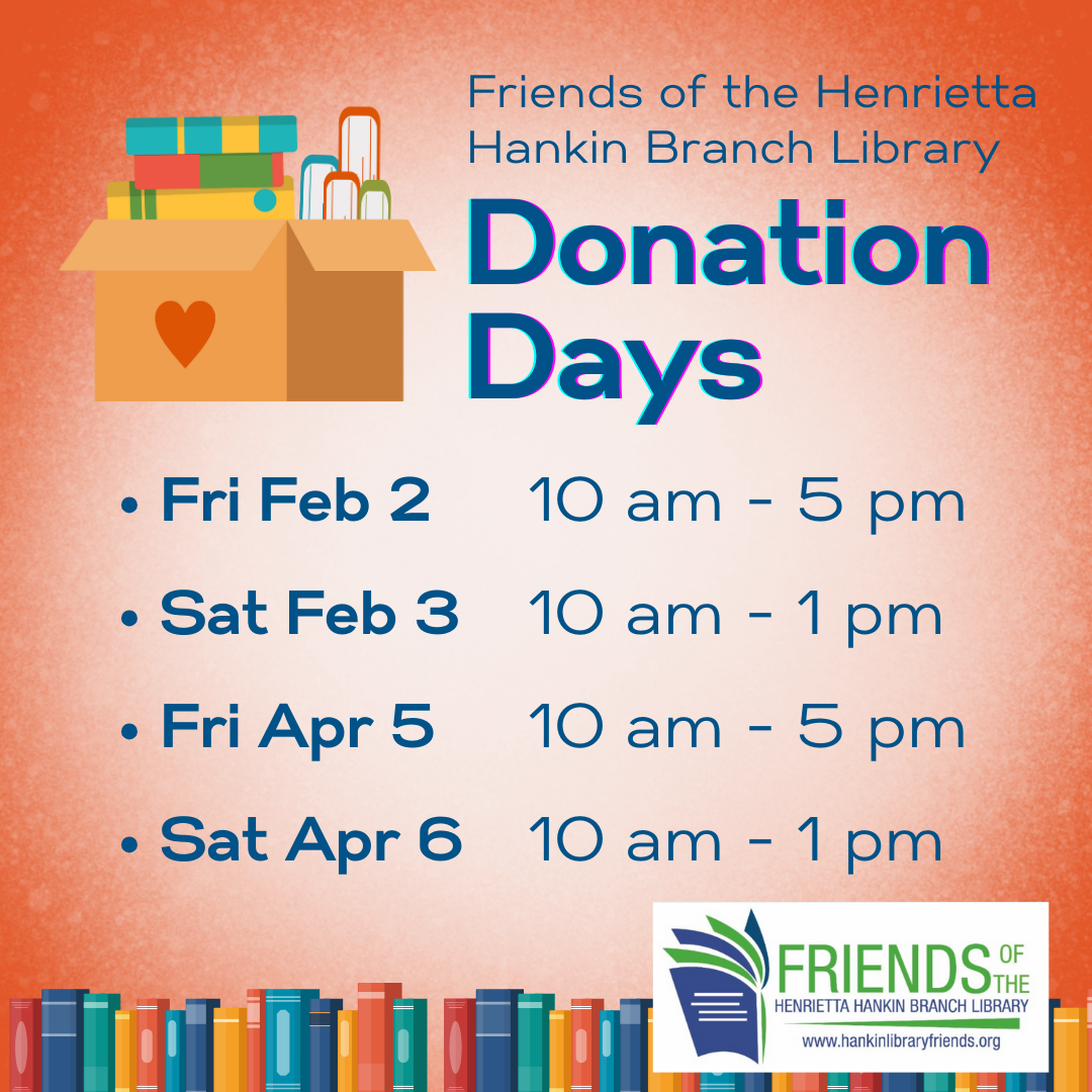 The Book Nook is open during library hours and is refreshed on a regular basis. All proceeds support the Henrietta Hankin Branch Library! For more information and to become a Friend, visit hankinlibraryfriends.org.