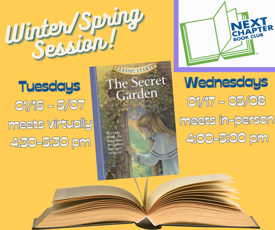 Our Winter Session begins January 16/17. Our Tuesday Club will continue to meet virtually via Zoom from 4:30-5:30 pm, while our Wednesday group will meet in-person at the library from 4:00-5:00 pm. To apply to take part in either of our Next Chapter Book Clubs, click here.