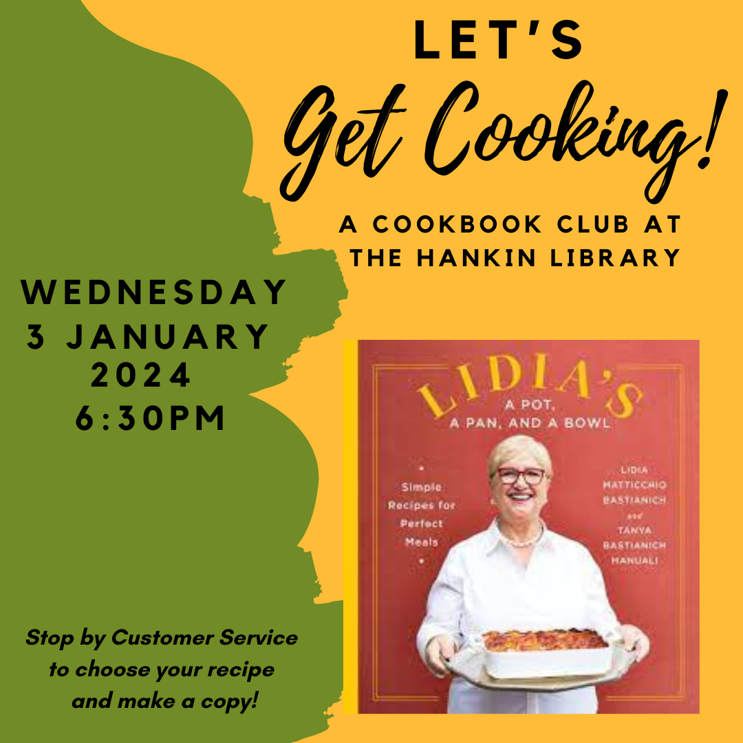 Let's Get Cooking features a special cookbook from our collection. Stop by the Reference Desk to browse this month's cookbook: Lidia's: A Pot, a Pan, and a Bowl. Choose a recipe, receive a photocopy and make that dish to bring to the meeting.