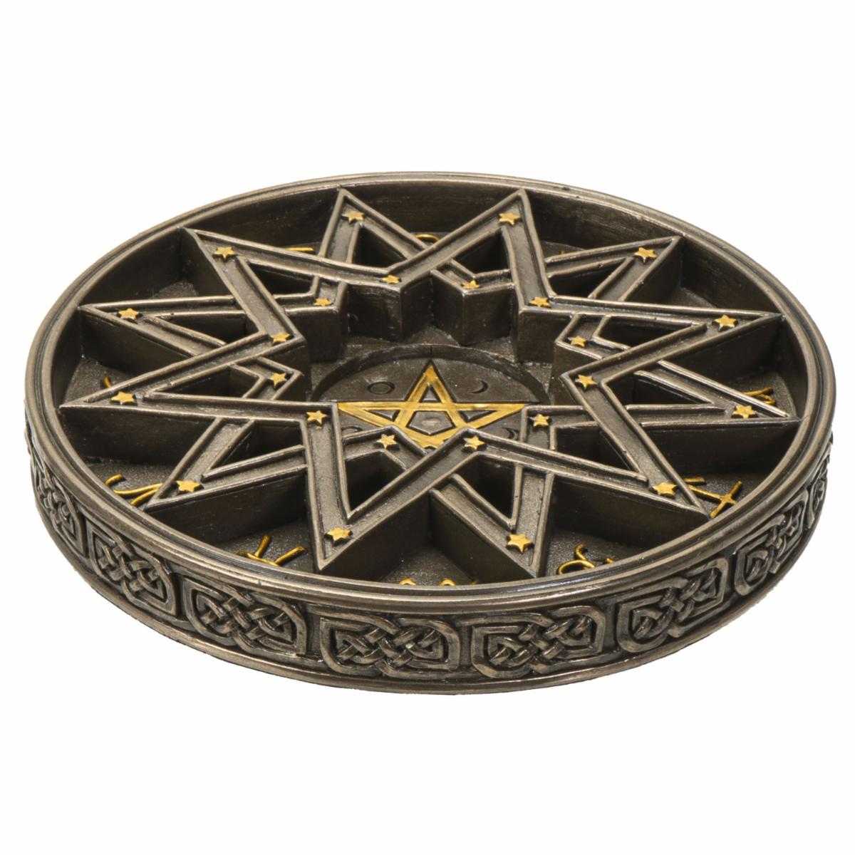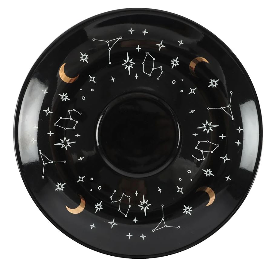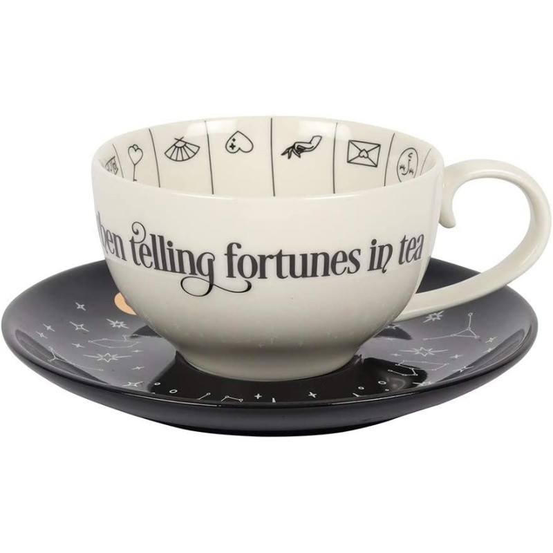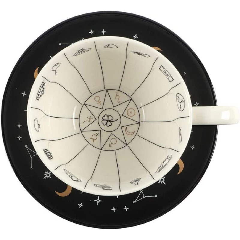 This unique fortune telling ceramic teacup features a variety of fortune-telling and astrological symbols accented by gold foil and includes a contrasting black saucer.
