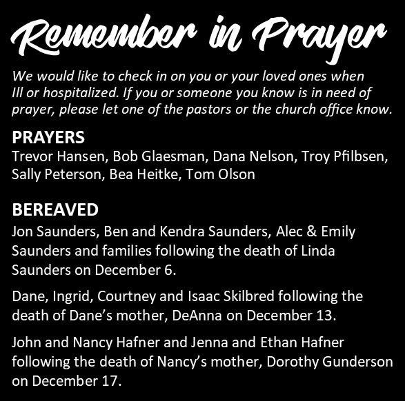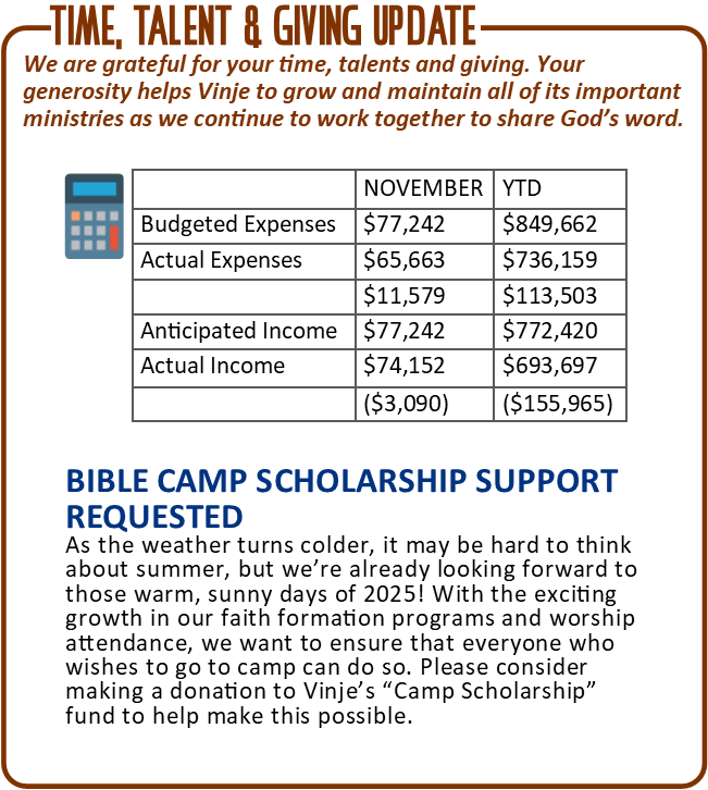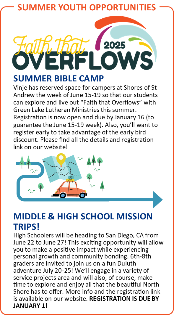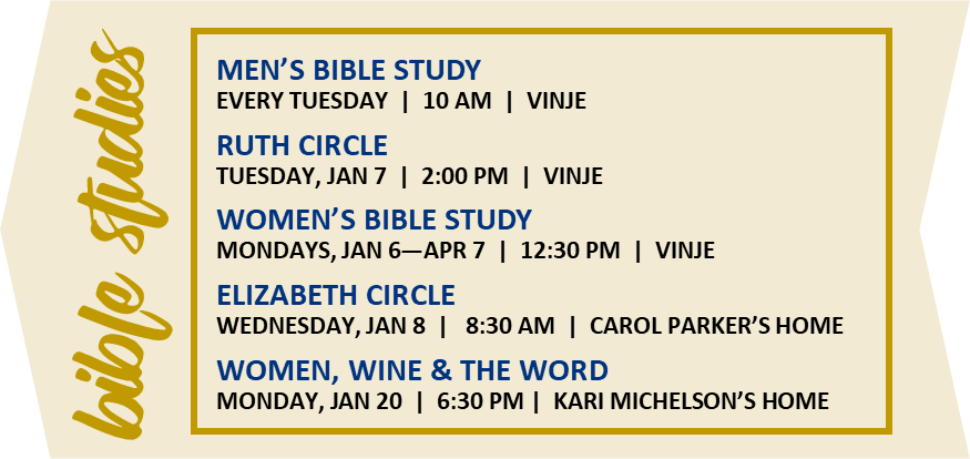 After all the emotions of the holidays, the joys and the letdowns, the family meals and get-togethers, as well as the family fights, as we enter into a new year, it seems like we just need a break. In the cold dark days of January, things seem a little dead anyway. But here at Vinje, the new year brings fresh opportunities for us as a community. Maybe this is the year you take a leap and start a small group, or share your musical talent, or volunteer in a new way. Maybe it’s the year we work together to serve our neighbors in new and creative ways. Whatever lies ahead, God is calling us to step boldly into the future, trusting that we are never alone on the journey.