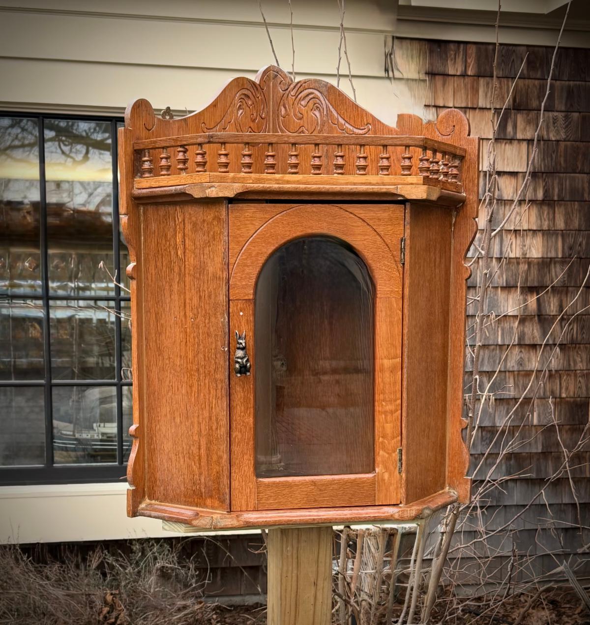 Many thanks to Beth Crane for donating it. According to Beth, it was the medicine cabinet at the family home, Packet Mail, the big yellow house across from Lothrop Hill Cemetery. Thanks also to Tim Hamel, our maintenance person, for refinishing and installing it!