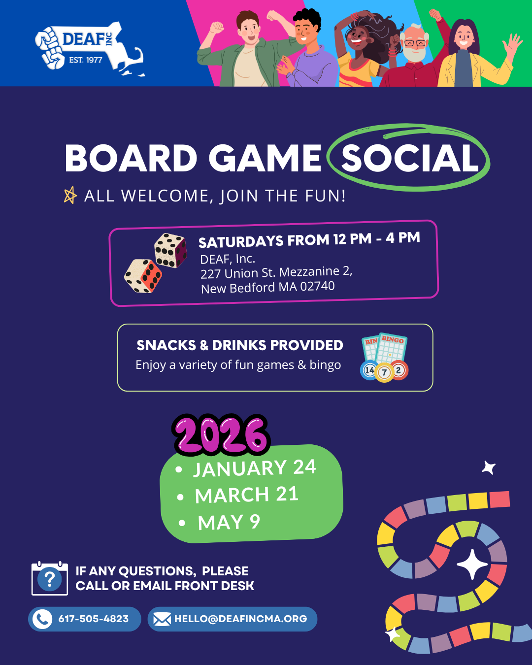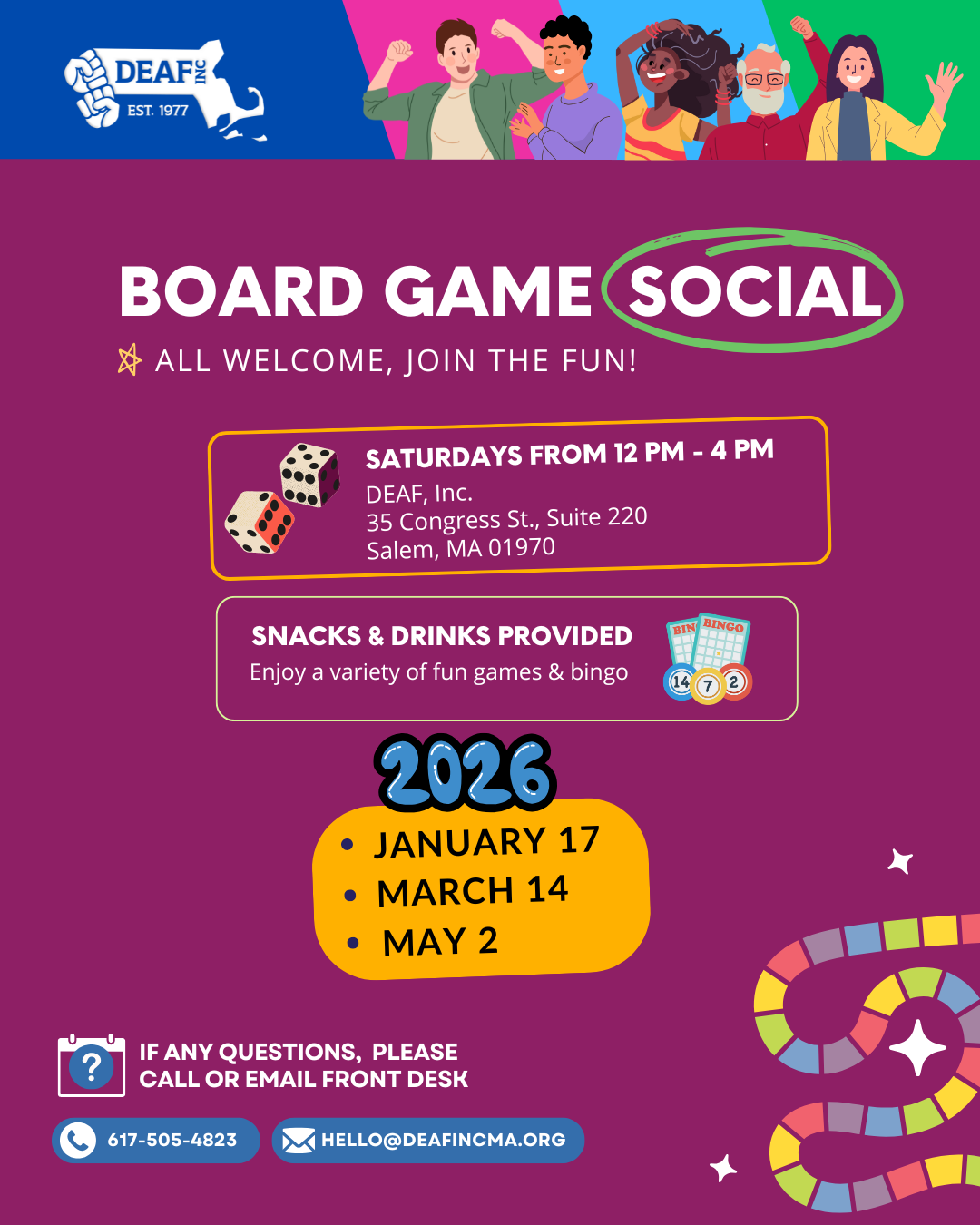 Image Description: This flyer is in dark maroon background with texts in white and colorful blocks and dices. On top border, five happy people celebrating with blue, pink, light blue, and green stripes and DEAF, Inc. logo in white. Board Game Social (circled). All welcome, join the fun! 11 AM - 3 PM EST at DEAF, Inc. Office 35 Congress St. Suite 220 Salem, MA 01970. Snacks & Drinks Provided. Enjoy a variety of fun games & Bingo. 2026 - January 17, March 14, May 2. If any questions, please call or email front desk at 6175054823 & hello@deafincma.org.