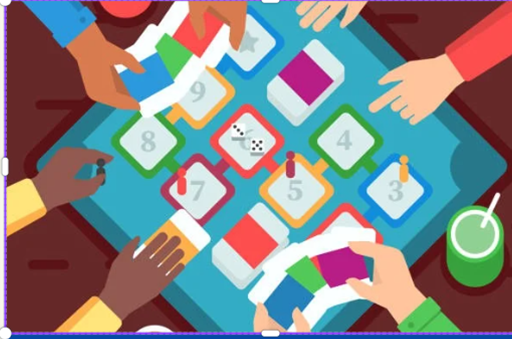 Image Description: This flyer is in dark blue background with texts in white and colorful blocks and dices. On top border, five happy people celebrating with blue, pink, light blue, and green stripes and DEAF, Inc. logo in white. Board Game Social (circled). All welcome, join the fun!