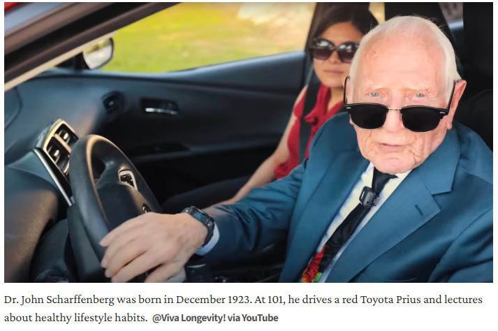 At 101 years old, Dr. John Scharffenberg drives a red Toyota Prius and is a YouTube star, sharing healthy living tips he himself follows, like intermittent fasting and eating a plant-based diet.