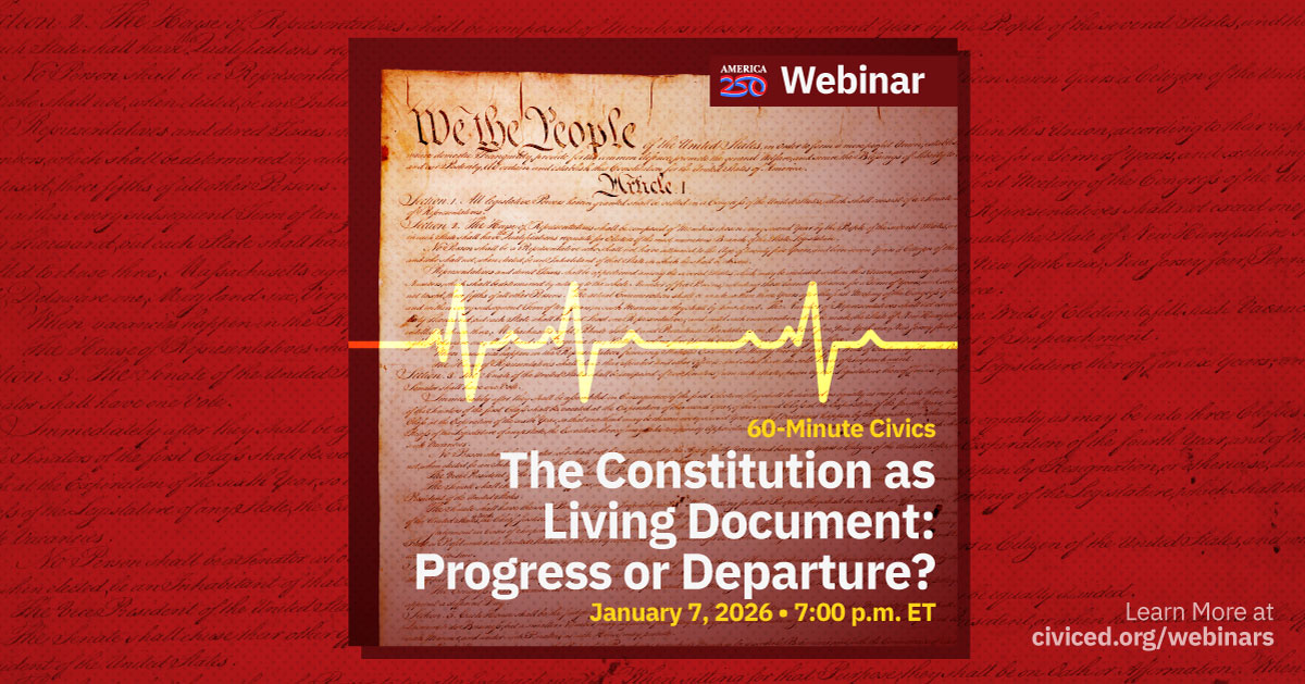 Ring in the new year with the Center for Civic Education's (CCE)next America 250 webinar, 60-Minute Civics: The Constitution as a Living Document: Progress or Departure?, on Wednesday, January 7.