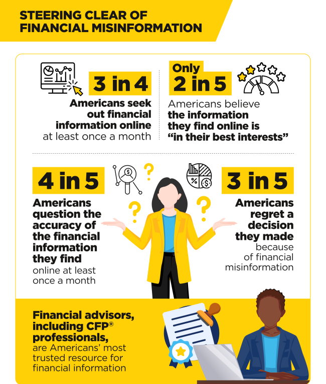| | Americans are increasingly navigating a complex landscape of online financial information. While three-quarters seek financial advice online at least once a month, four in five question the accuracy of what they find. The consequences are real: three in five Americans regret a financial decision influenced by misinformation, and only two in five believe online financial information serves their best interests. Amid this uncertainty, financial advisors—including CFP® professionals—remain Americans' most trusted resource for financial guidance, underscoring the importance of consulting qualified professionals when making significant financial decisions. | |