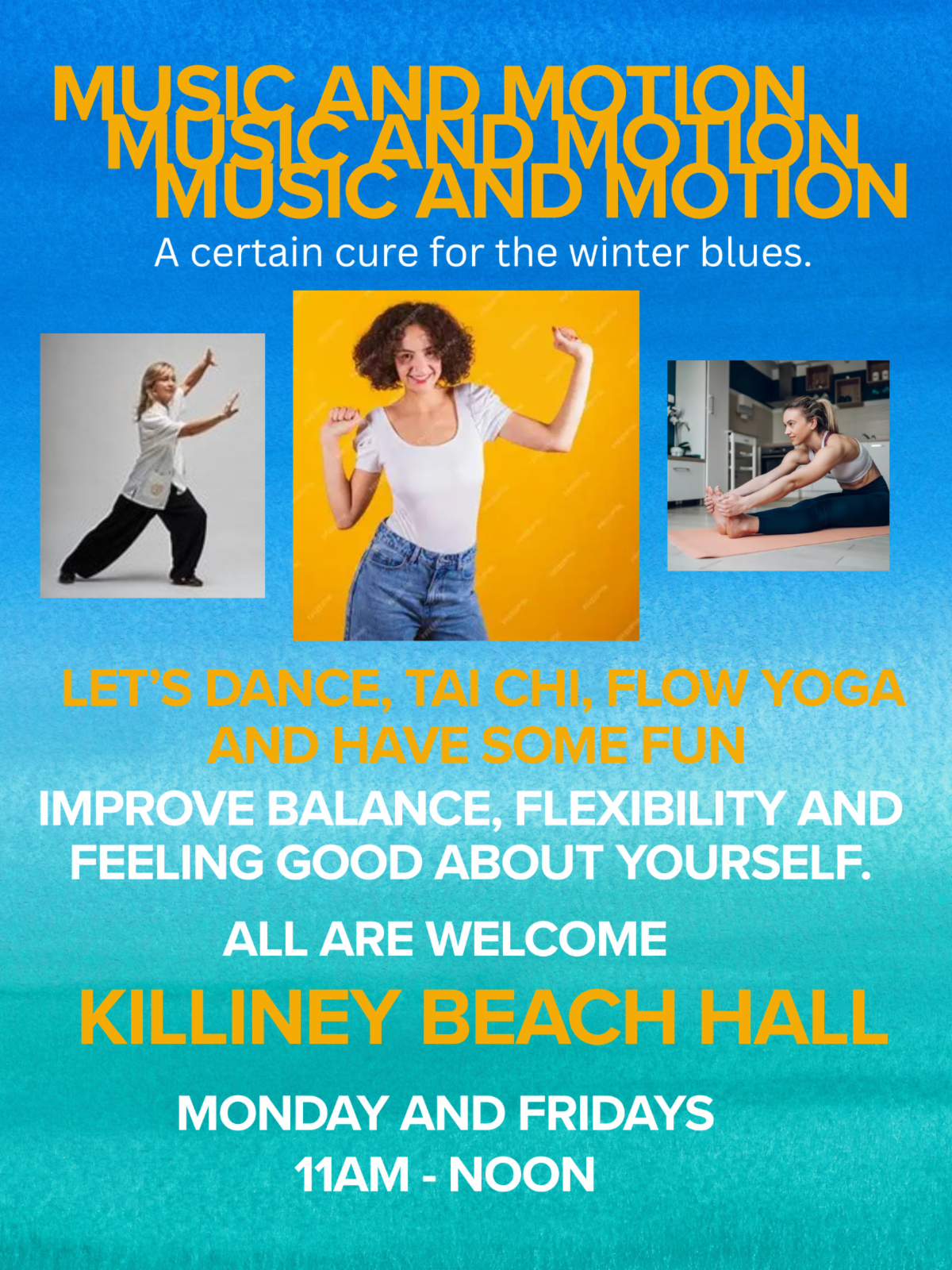 Come join our "Music and Movement" sessions as we Dance, Tai Chi and Flow Yoga our way to body awareness and feeling good. INFORMAL sessions with great music. It's a Jeans and T's kind of morning.