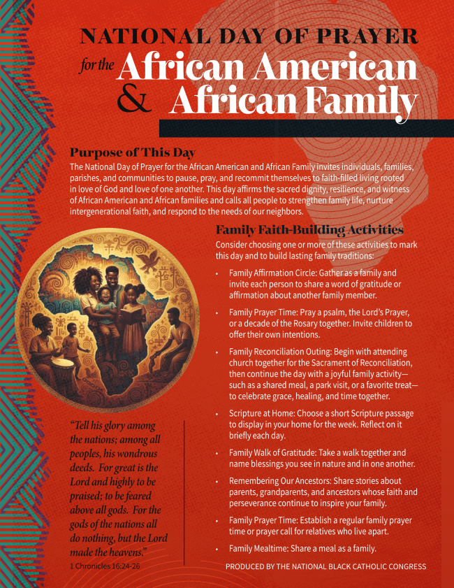 The National Day of Prayer for the African American and African Family, observed on Sunday, February 1, 2026, is a special occasion for reflection and unity. This year, the National Black Catholic Congress has enriched the celebration with an updated Prayer Booklet, featuring a beautiful reflection by Dr. Ansel Augustine from the USCCB's Office of African American Affairs for the Secretariat of Cultural Diversity in the Church. For those seeking ways to commemorate this meaningful day, a resource guide is available, offering a variety of activities that families, parishes, and communities can enjoy doing together.