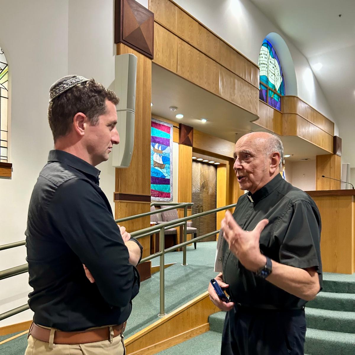 | Dr. Benny Bar-Lavi, the Maureen and Douglas Cohn Visiting Chair in Jewish Thought, in dialogue with an attendee of the CCJS Visit a Synagogue and Church program, co-hosted by Rabbi Danielle Upbin and Rabbi David Weizman of Congregation Beth Shalom, Clearwater, FL. | | |