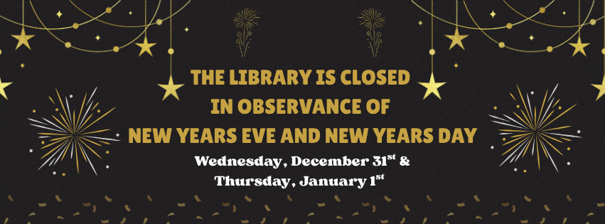 The library will be closed Wednesday, December 31st & Thursday, January 1st in observance of the holiday. We will reopen Friday, January 2nd at 9:00am.