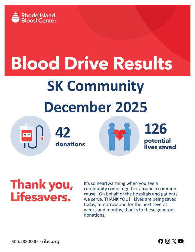 The Town of South Kingstown thanks all employees and residents who participated in the RI Blood Center donation event on December 9. Your generosity and strong turnout helped support local hospitals and patients across Rhode Island. Whether you donated, encouraged others, or helped spread the word, your efforts made a meaningful difference. Together, South Kingstown once again showed the power of community—every drop truly counts.