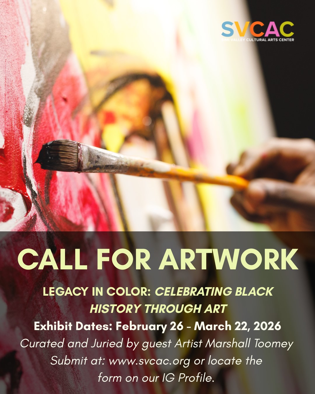 Call to Artists Deadline on Tuesday, January 20th: The CAC invites Black artists to submit up to five two-dimensional artworks for Legacy in Color: Celebrating Black History Through Art, curated by guest artist Marshall Toomey. The exhibition honors Black culture through visual storytelling and artistic expression. Exhibit dates are Thursday, February 26th through Sunday, March 22nd.