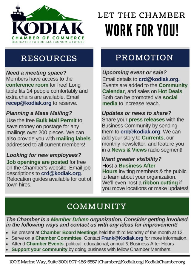 We'll also have the ever popular Split-The-Pot for your chance to win half the Chamber collected cash at the end of the evening. The other half of the proceeds go to the Kodiak Chamber of Commerce Scholarship Fund.