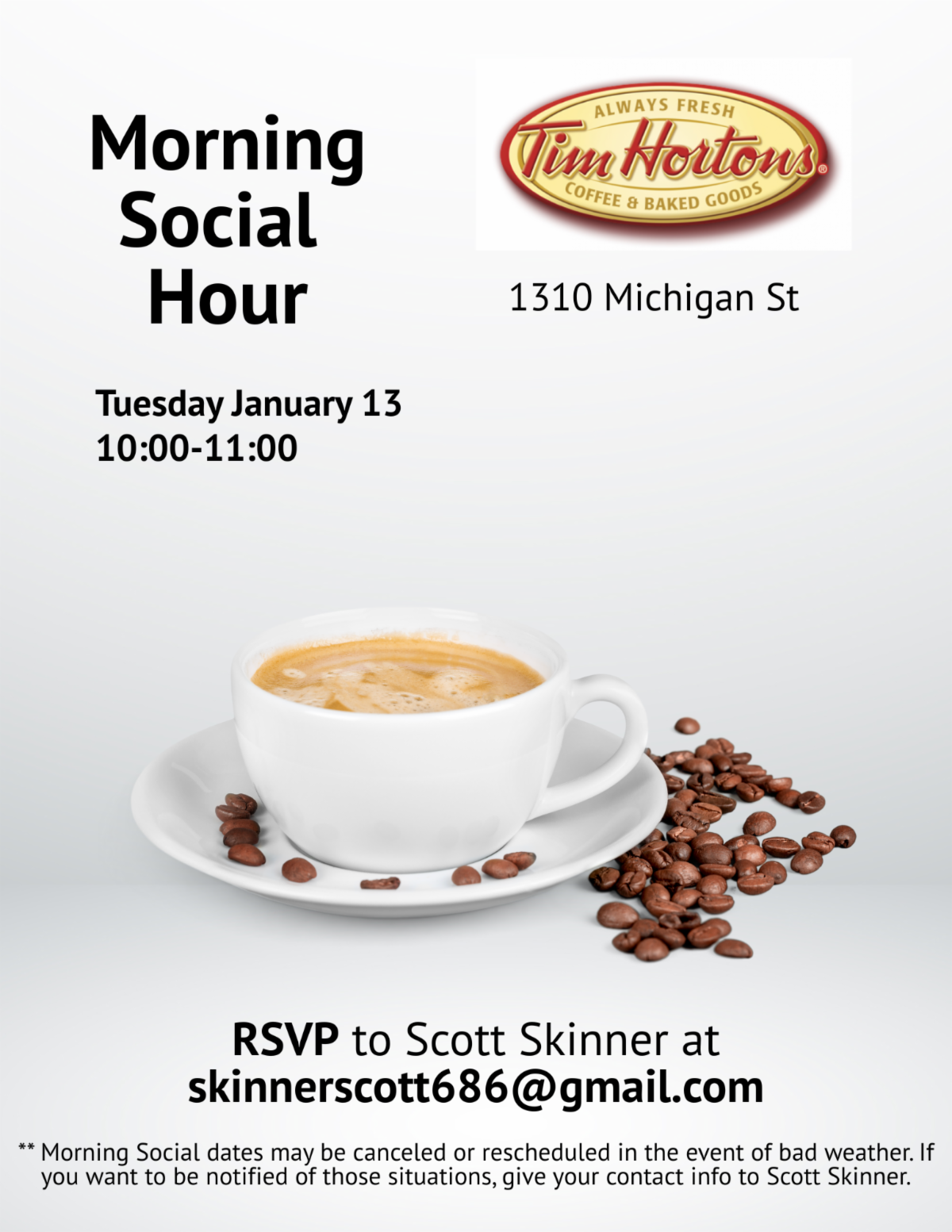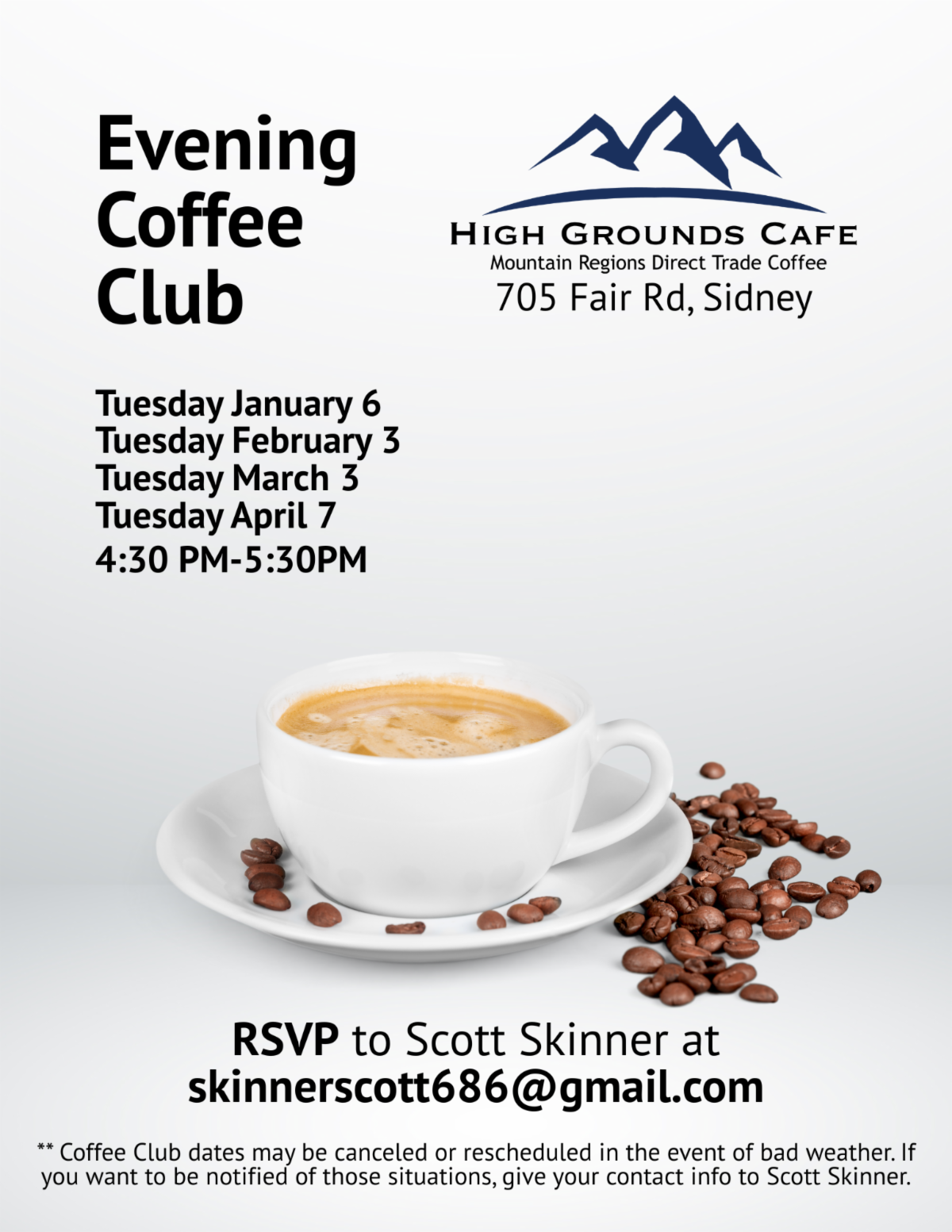 *Coffee Club dates may be canceled or rescheduled in the event of bad weather. If you want to be notified of those situations, give your contact info to Scott Skinner