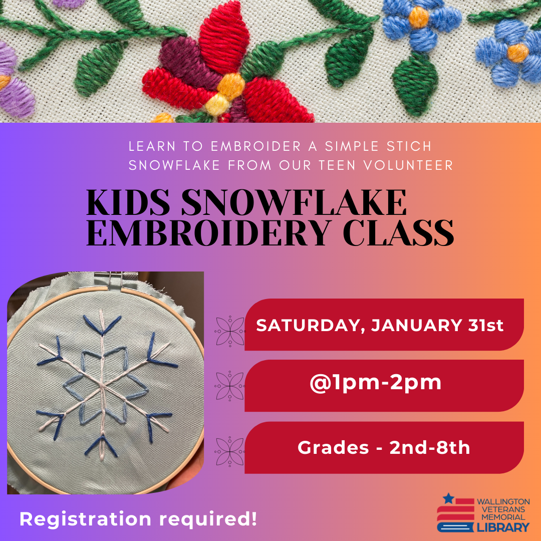Kids ages 8 and up will learn to do simple embroidery stiches to make their own elegant snowflake from one of our teen volunteers.