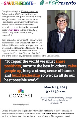 Please continue to keep us informed of what's happening with you in Bucks and Montgomery Counties. The information here comes from you, with links to our website for more complete information and resources. Send your events and updates to Kristyn: kristyn@bucksmontcollab.org. Thank you!