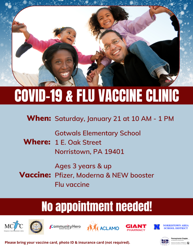 MCIC is partnering with Gotwals Elementary School, ACLAMO, Norristown NAACP, Community Hero, Giant Pharmacy & PAIC on a COVID-19 & Flu Vaccine Clinic at the School on January 21. No appointment needed!