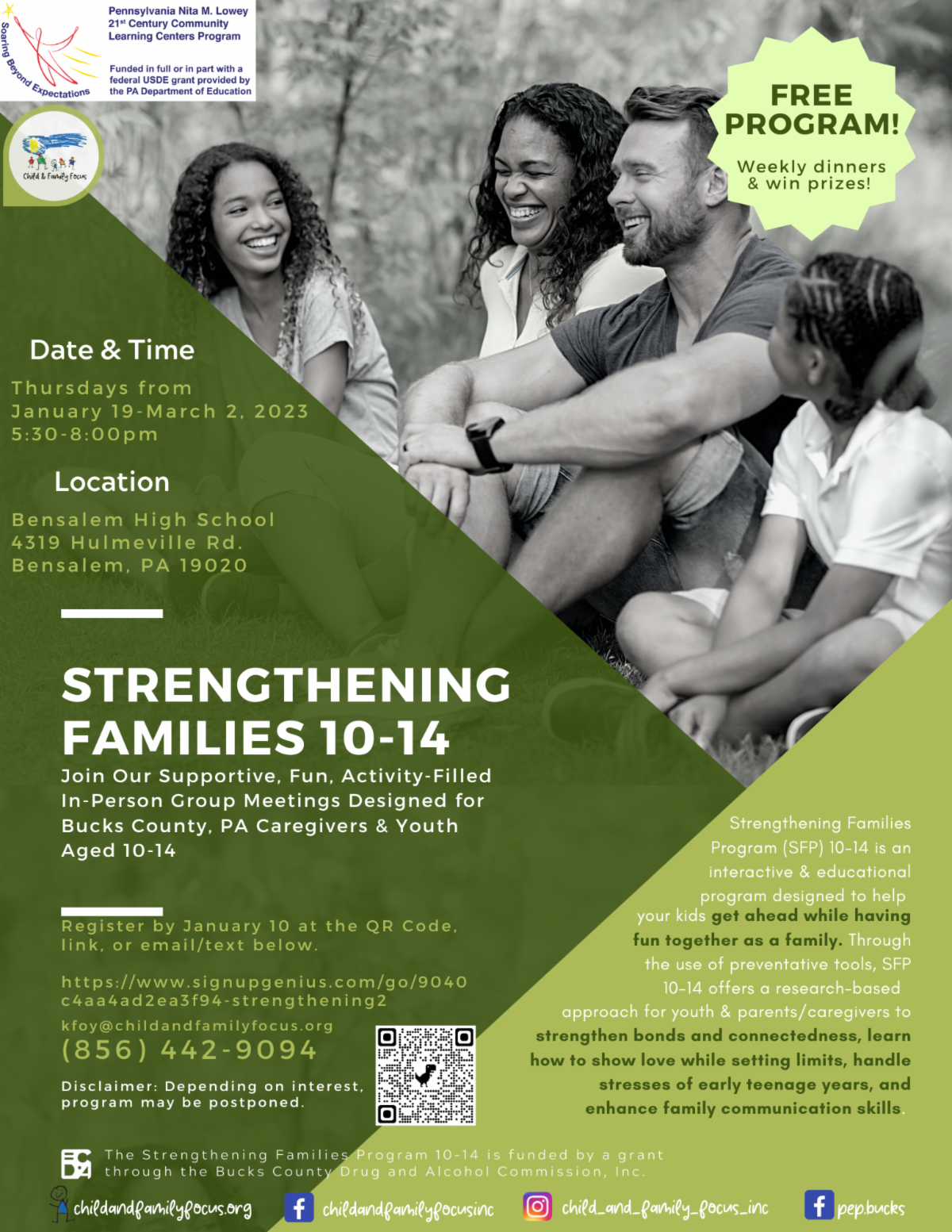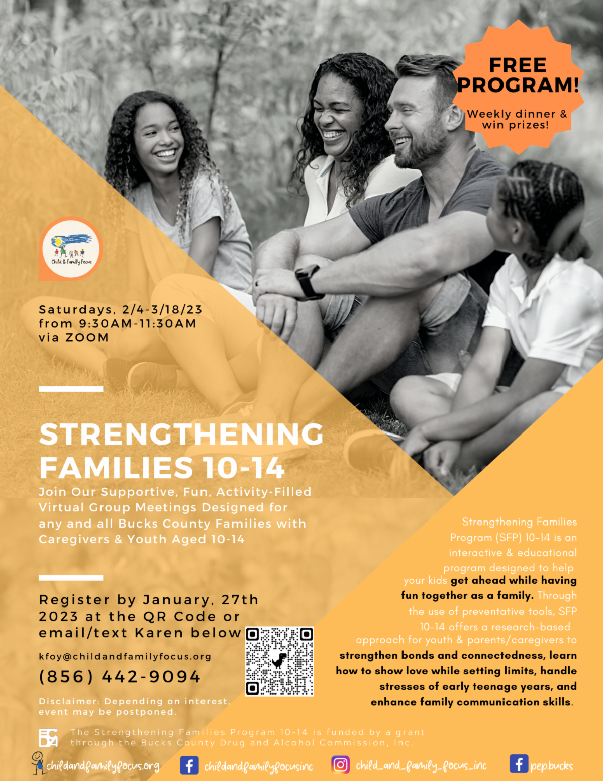 Child and Family Focus, Inc. is bringing a free, award-winning, evidence-based prevention program, Strengthening Families, for parents/caregivers and youth ages 10-14 (SFP 10-14) to Bucks County families back-to-back!
