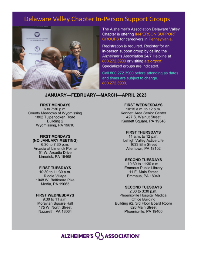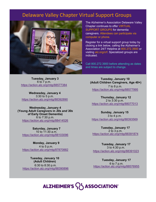 The Alzheimer's Association Delaware Valley Chapter continues to offer virtual, in-person and on-demand options for community education as well as in-person, Zoom and conference call options for caregiver support groups.