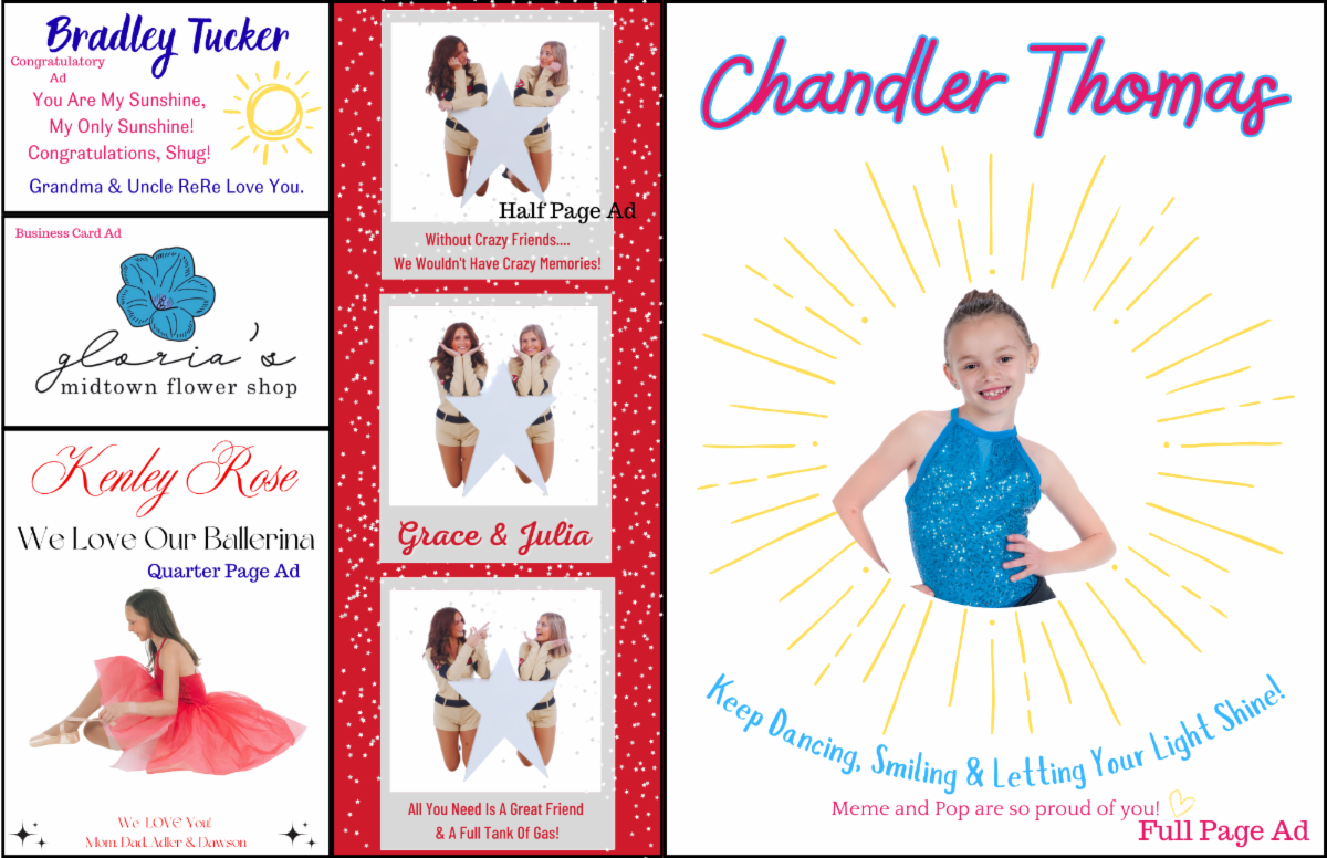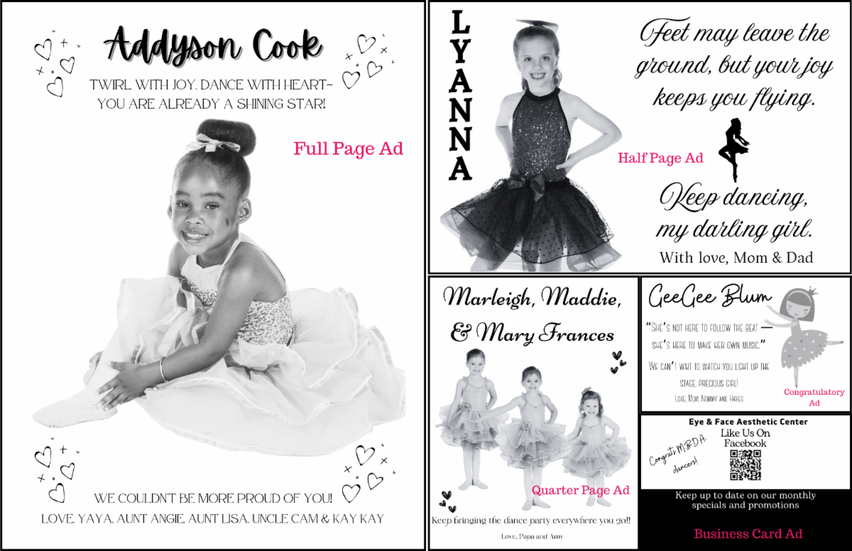 Every year, one of the highlights of our recital is the beautiful keepsake Program Book that showcases our studio and celebrates our dancers. Each family is encouraged to support their dancer by purchasing or selling an ad that may include a photo, words of wisdom, best wishes, or a special congratulations message.