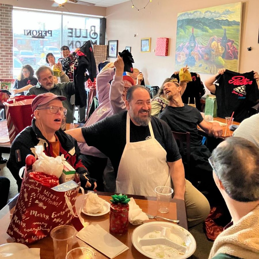 | | Celebrating the Holidays with Pietra's Pizza | | Pietra’s Pizza and Italian Restaurant in Wheat Ridge, a valued DDRC Partner, has proudly sponsored our Therapeutic Recreation holiday gift exchange for over 10 years! This year, more than 40 attendees—including Recreation participants, staff, and Pietra’s hosts—enjoyed a fun-filled celebration. | | |