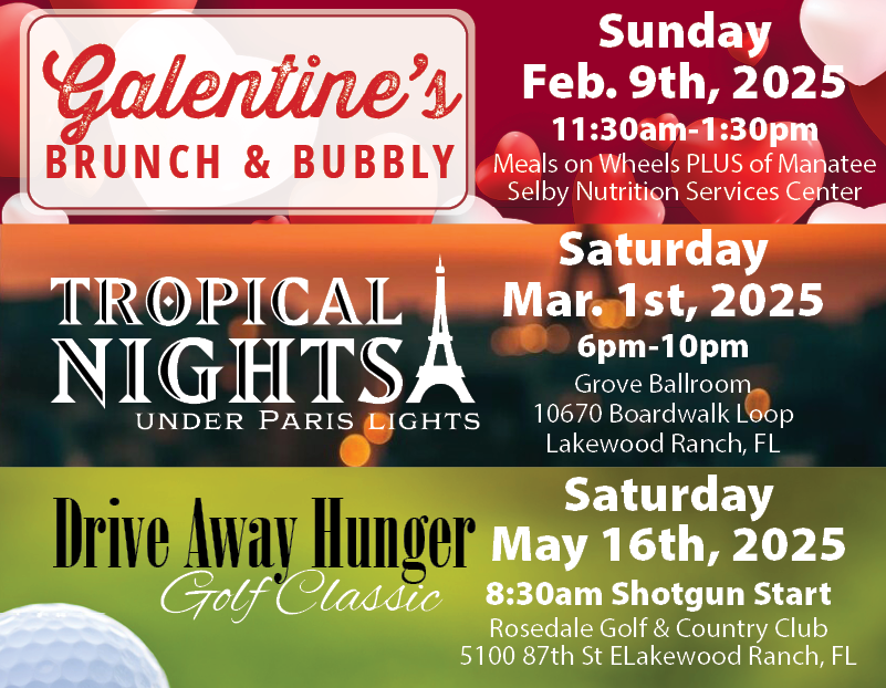 If you are looking for a great way to show your support for our lifesaving mission, Annual Sponsorship is a great option! Our vibrant Annual Sponsorship program is available for businesses and individuals and includes visibility, tickets to events, and more! Click here to learn more about becoming an Annual Sponsor in 2025. Please call or email Kelly Pinskey (kpinskey@mealsonwheelsplus.org or 941-747-4655) to discuss further and sign up! | |
