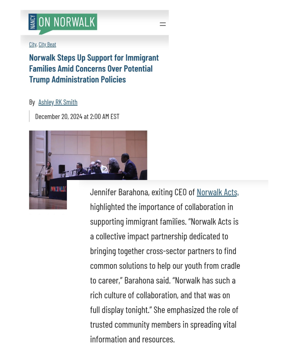 This past Monday marked Jennifer’s last day at Norwalk ACTS. We are deeply grateful for her incredible contributions to our community and will miss her dearly. Join us in celebrating Jennifer at a farewell party on January 27th, 5:30–7:30 PM at BJ Ryan's, as we thank her and wish her well in her new role at the state level. Please RSVP here.