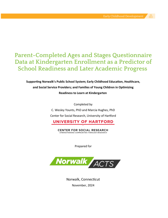 The University of Hartford Center for Social Research work validates Norwalk ACTS Early Childhood Development Initiative as a model for screening, tracking, and promoting young children’s development that could be implemented across the state and the country. It is critical for this early childhood development work to be done collectively across different sectors including many organizations that work with children from infancy to 5 years of age. In addition, creating a community wide data infrastructure is important to collect the results of the parent completed screenings and allow for these results to be aligned with teacher completed assessments and student results from standardized tests.