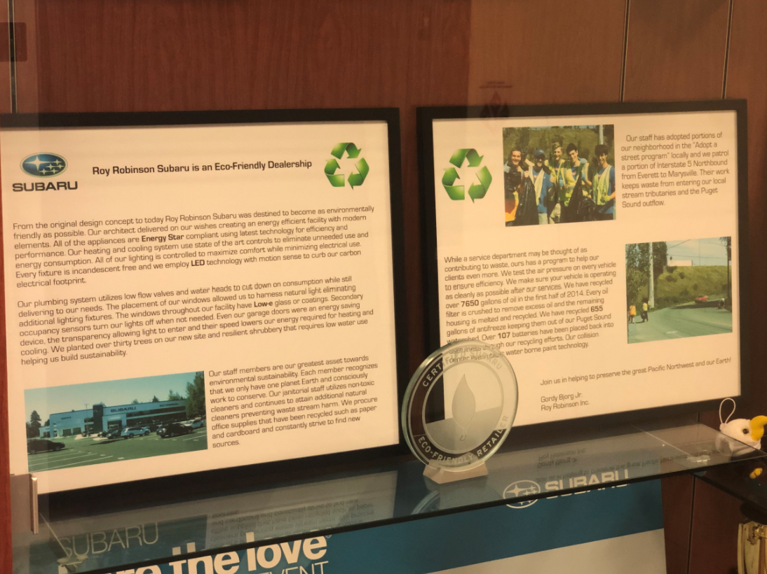 Also requested during the recertification process: pictures showing the Eco-Display and the Eco-Trophy. The Eco-Trophy may be part of the Eco-Display or displayed separately, but regardless, Subaru wants retailers to have both clearly visible to customers.