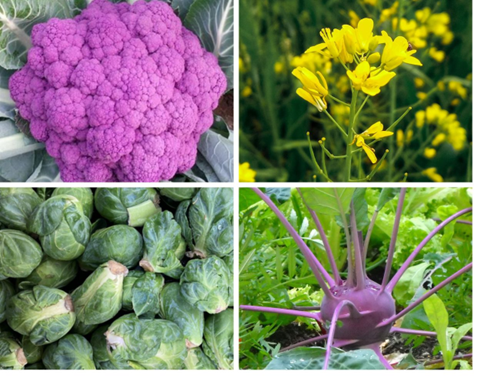 Photo: Cauliflower (Master Gardeners of Napa County), yellow mustard (Sallman Hayat, Pixabay), kohlrabi (Pixabay), Brussels sprouts (Pixabay)