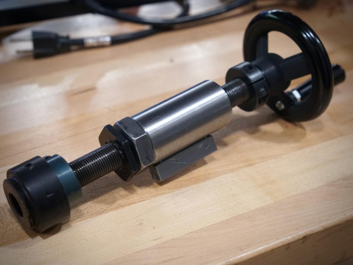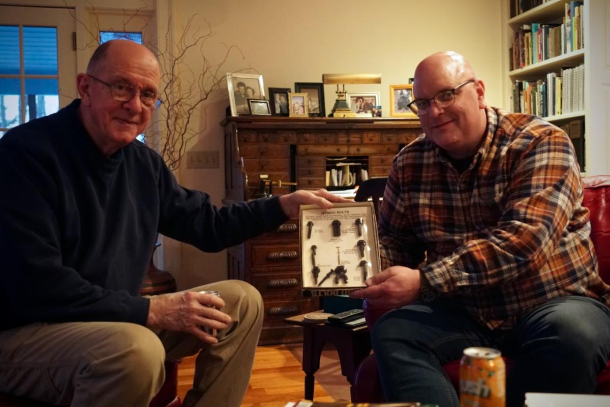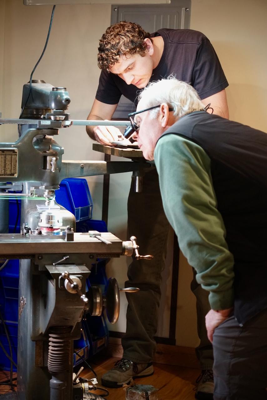 No Plumier tour of New England could be complete without a stop at the home of Frank and Patty Dorion. A delicious dinner with friends and some time in Frank’s shop was a perfect way to end the whirlwind tour before heading back to Pennsylvania. | | Christian inspecting the Pudsey Dawson geometric slide rest | | | Always eager to help a fellow craftsperson in need, Frank presented David with a unique hardware set that should help him get out of any machining trouble of his own making. | | | | |
