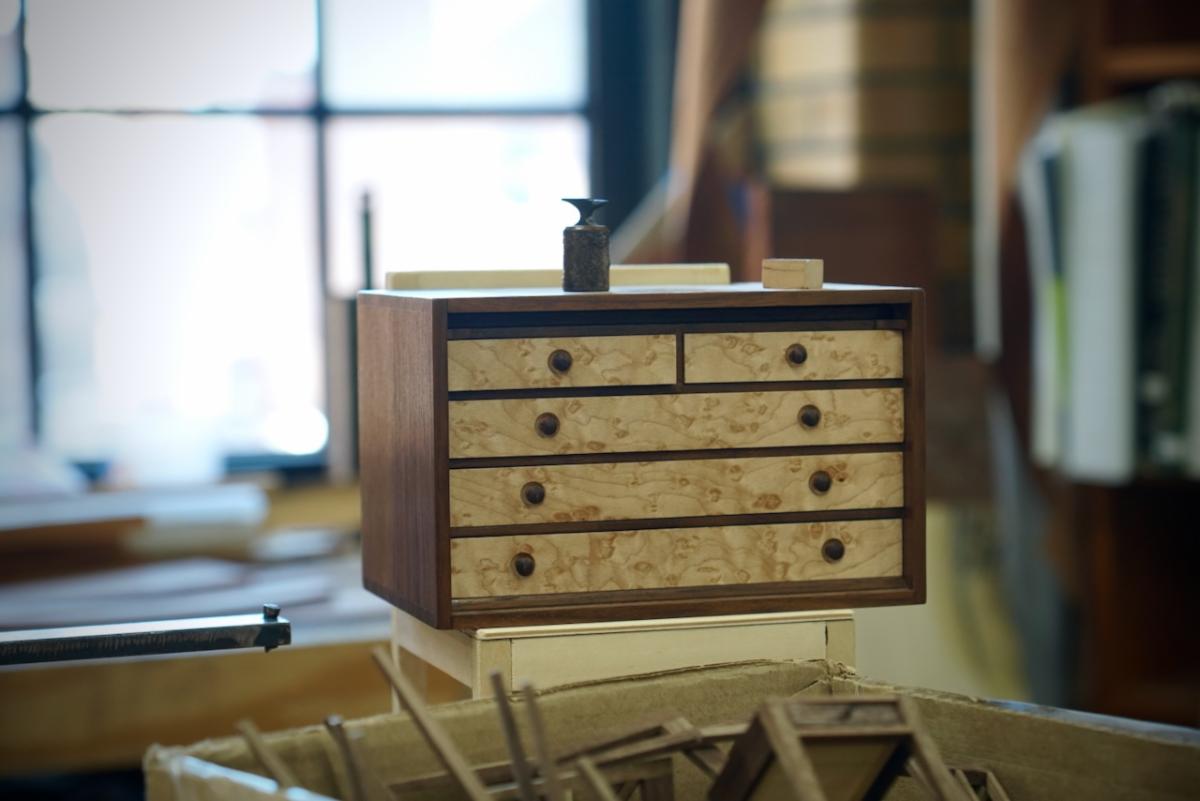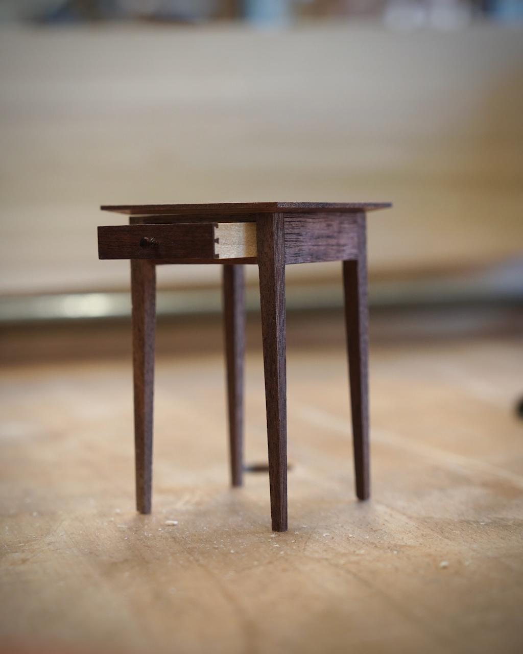 In additional to the beautiful full-scale furniture Zach has made since starting at NBSS, he has also thoroughly caught the miniature bug. This affliction was surely not helped when he met master miniaturist Bill Robertson at Plumier last summer during his internship, who’s work is an inspiration to woodworkers and toolmakers of every scale. Between his regular course work, Zach has found time to produce a run of miniature, Shaker-style side tables, complete with dovetail drawers. He is selling these charming tables to help subsidize his tuition and expenses.