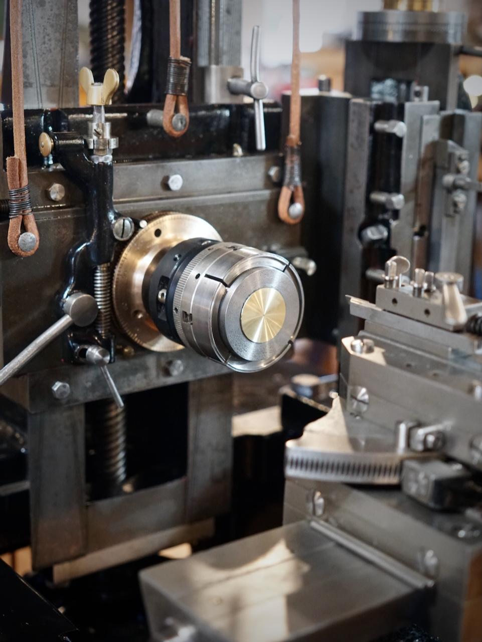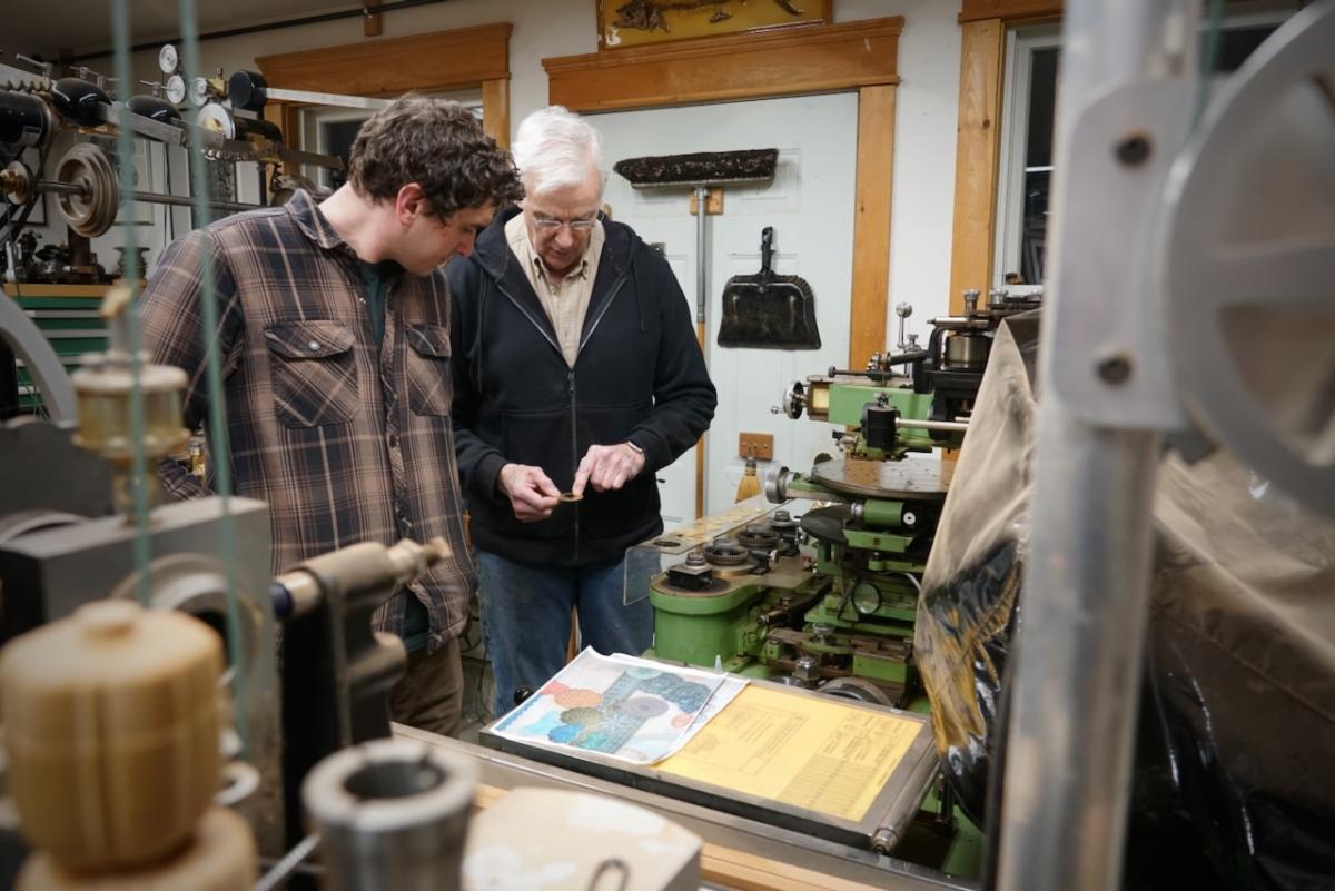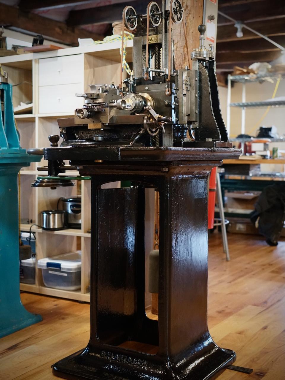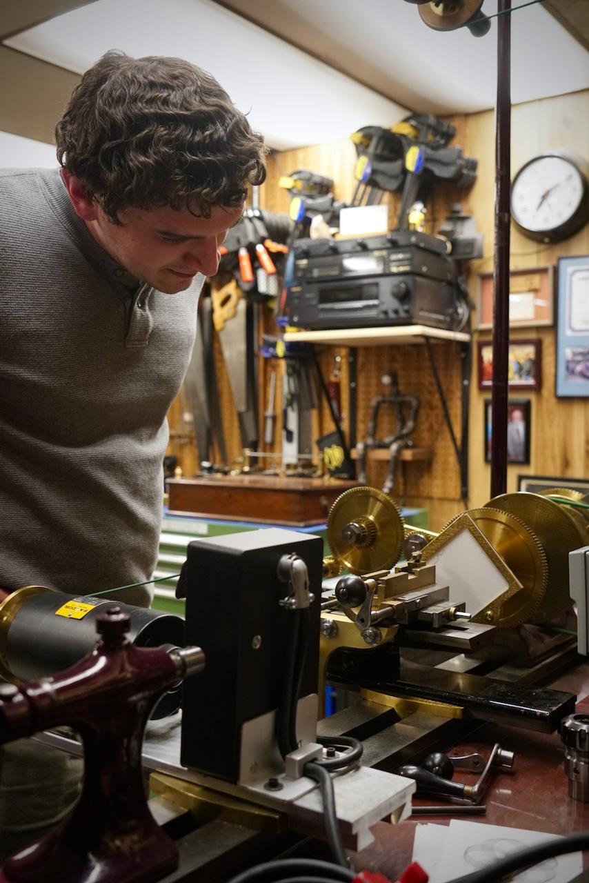 | | | Scale model of the full-sized tool chest Zach made | The next batch of table parts ready for assembly | | | | Keep up with Zach’s current full-scale project, this incredible Georgian-style sideboard, by following him on Instagram. | | | Both NBSS and Plumier have a model airplane from the collection of the late architect, amateur cabinet maker, and clock collector Randal Thompson hanging from the ceiling. | | | The Plumier winter storm tour continued even further north-east with a visit to the shop of legendary complex turner and tool maker Fred Armbruster in Maine. Fred gave us a tour of his shop and his unbelievable collection of work done by himself and members of the complex turning community. As always, Fred was extremely generous with his time and hard earned knowledge of everything to do with complex turning. | | Fred introduces Christian to his multistage geometric lathe from the Swiss mint | | There was particular interest in his current project. He is building out a full lathe around the orphaned headstock of a very early Holtzapffel rose engine. The headstock is unnumbered and has a completely different construction than other Holtzapffel rose engines like Plumier’s No.1636. Like all of Fred’s work, this rose engine is shaping up to be a stunning machine. In addition to the brass headstock, what is likely the original rosette barrel will also be used. It will be great to see this interesting piece of complex turning history put back into service in a suitable way. Fred has been sharing updates of the project on Instagram and on the OTI Facebook page. | | | Fred's complete reproduction of the famous Studley tool chest | | | From Maine, we began our meandering way back west with a stop in New Hampshire to visit members Denis and Heidi Carignan of Carignan Watch Company. | | Denis gave us a tour of his shop and shared what he has been working on. Largely self-taught, Denis is like a MacGyver of watchmaking. Whatever the problem is, he will engineer a solution. His shop is full of these solutions in the form of extremely sophisticated home-built machines and processes. He embraces technology in new and exciting ways while using his extensive experience in traditional methods and hand skills to back it up. Denis’ mad-genius tendencies are kept in check by his wife Heidi who runs the business and customer-facing side of the operation. Carignan Watch has found a particular niche in the extremely difficult job of vintage watch dial refinishing. | | Denis gave us a close look at this antique egg watch that he had just finished restoring in collaboration with Plumier member Steve Franke, who spent a week with the Carignans learning from Denis and lending his perspective as a clockmaker to the project. See the before and after pictures along with more of their work on the Carignan Watch Company Instagram. | | From the Carignans’, we continued west over the Connecticut River into Vermont to visit the American Precision Museum at the old Robbins and Lawrence Armory in Windsor. The armory, built in 1846, was a part of a revolution in precision that took place in the Connecticut River Valley, resulting in the “American System’ of manufacturing with interchangeable parts. | | The Robbins and Lawrence Armory in the 1860s | | | | Gunstock copy lathe first invented by Thomas Blanchard in 1818 | | Today, the museum houses an impressive collection of early American precision machine tools. There is also a focus on interactive learning, with activities and workshops aimed at getting children interested in engineering and potential careers in manufacturing. The museum is currently under construction to expand to a second floor later this year. Learn more about the museum from their website. | | |
