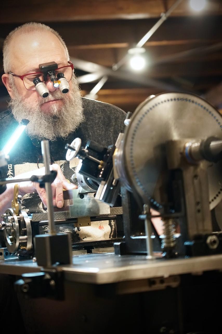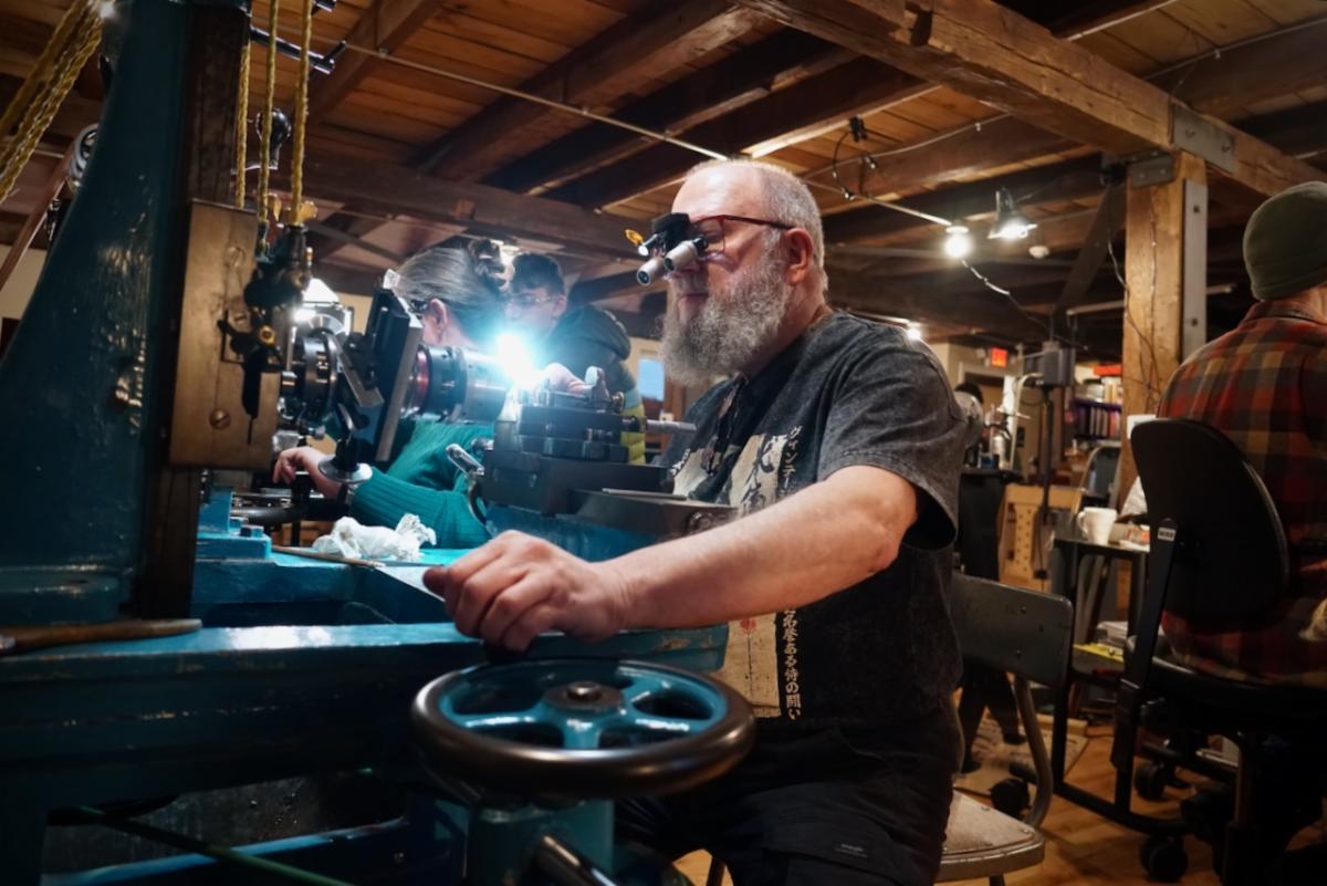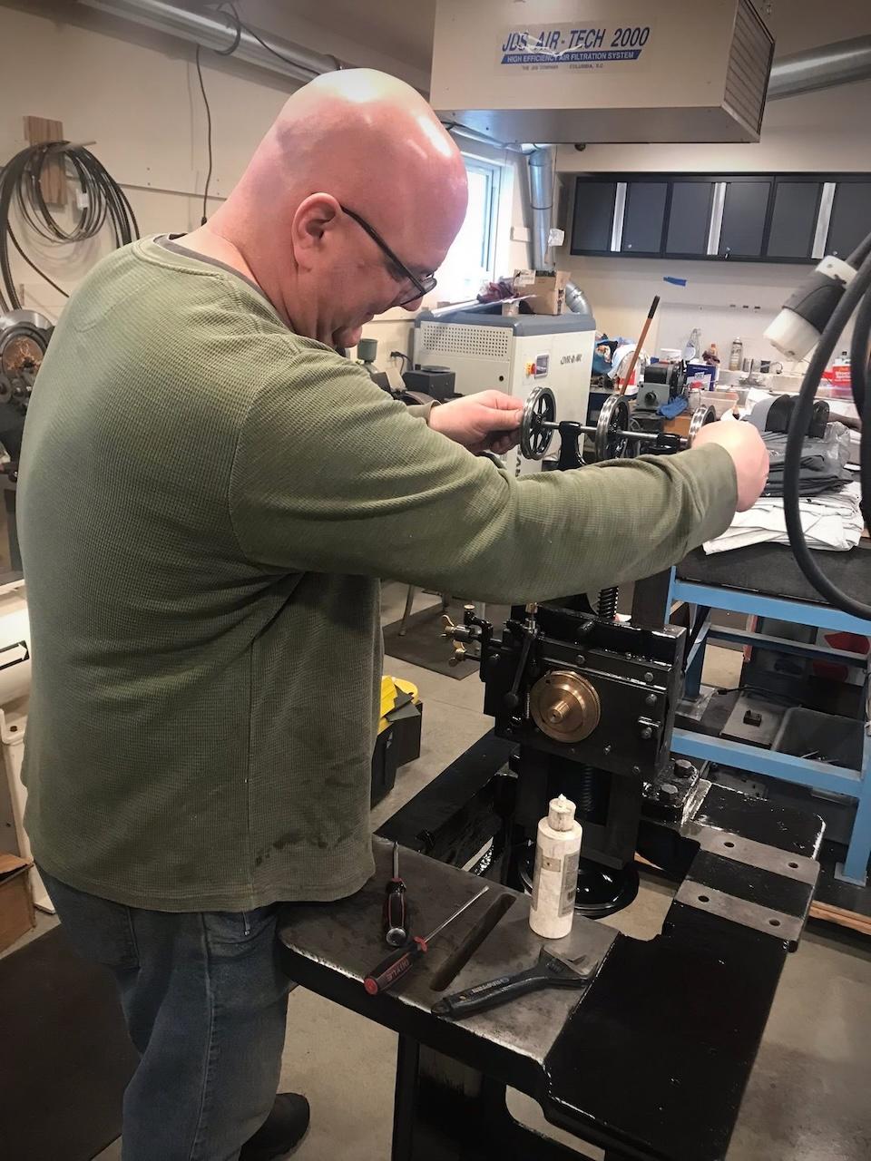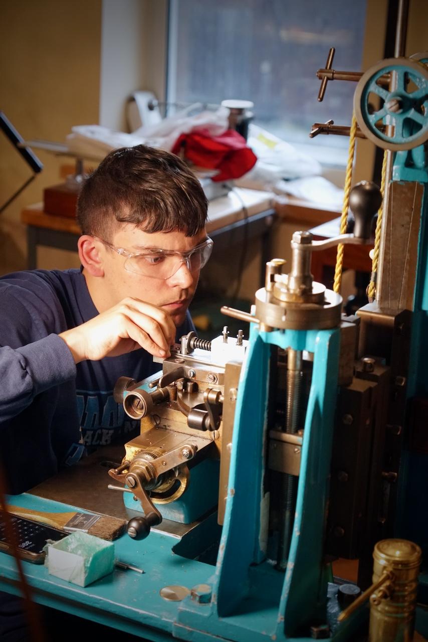 | | | Scale model of the full-sized tool chest Zach made | The next batch of table parts ready for assembly | | | | Keep up with Zach’s current full-scale project, this incredible Georgian-style sideboard, by following him on Instagram. | | | Both NBSS and Plumier have a model airplane from the collection of the late architect, amateur cabinet maker, and clock collector Randal Thompson hanging from the ceiling. | | | The Plumier winter storm tour continued even further north-east with a visit to the shop of legendary complex turner and tool maker Fred Armbruster in Maine. Fred gave us a tour of his shop and his unbelievable collection of work done by himself and members of the complex turning community. As always, Fred was extremely generous with his time and hard earned knowledge of everything to do with complex turning. | | Fred introduces Christian to his multistage geometric lathe from the Swiss mint | | There was particular interest in his current project. He is building out a full lathe around the orphaned headstock of a very early Holtzapffel rose engine. The headstock is unnumbered and has a completely different construction than other Holtzapffel rose engines like Plumier’s No.1636. Like all of Fred’s work, this rose engine is shaping up to be a stunning machine. In addition to the brass headstock, what is likely the original rosette barrel will also be used. It will be great to see this interesting piece of complex turning history put back into service in a suitable way. Fred has been sharing updates of the project on Instagram and on the OTI Facebook page. | | | Fred's complete reproduction of the famous Studley tool chest | | | From Maine, we began our meandering way back west with a stop in New Hampshire to visit members Denis and Heidi Carignan of Carignan Watch Company. | | Denis gave us a tour of his shop and shared what he has been working on. Largely self-taught, Denis is like a MacGyver of watchmaking. Whatever the problem is, he will engineer a solution. His shop is full of these solutions in the form of extremely sophisticated home-built machines and processes. He embraces technology in new and exciting ways while using his extensive experience in traditional methods and hand skills to back it up. Denis’ mad-genius tendencies are kept in check by his wife Heidi who runs the business and customer-facing side of the operation. Carignan Watch has found a particular niche in the extremely difficult job of vintage watch dial refinishing. | | Denis gave us a close look at this antique egg watch that he had just finished restoring in collaboration with Plumier member Steve Franke, who spent a week with the Carignans learning from Denis and lending his perspective as a clockmaker to the project. See the before and after pictures along with more of their work on the Carignan Watch Company Instagram. | | From the Carignans’, we continued west over the Connecticut River into Vermont to visit the American Precision Museum at the old Robbins and Lawrence Armory in Windsor. The armory, built in 1846, was a part of a revolution in precision that took place in the Connecticut River Valley, resulting in the “American System’ of manufacturing with interchangeable parts. | | The Robbins and Lawrence Armory in the 1860s | | | | Gunstock copy lathe first invented by Thomas Blanchard in 1818 | | Today, the museum houses an impressive collection of early American precision machine tools. There is also a focus on interactive learning, with activities and workshops aimed at getting children interested in engineering and potential careers in manufacturing. The museum is currently under construction to expand to a second floor later this year. Learn more about the museum from their website. | | |