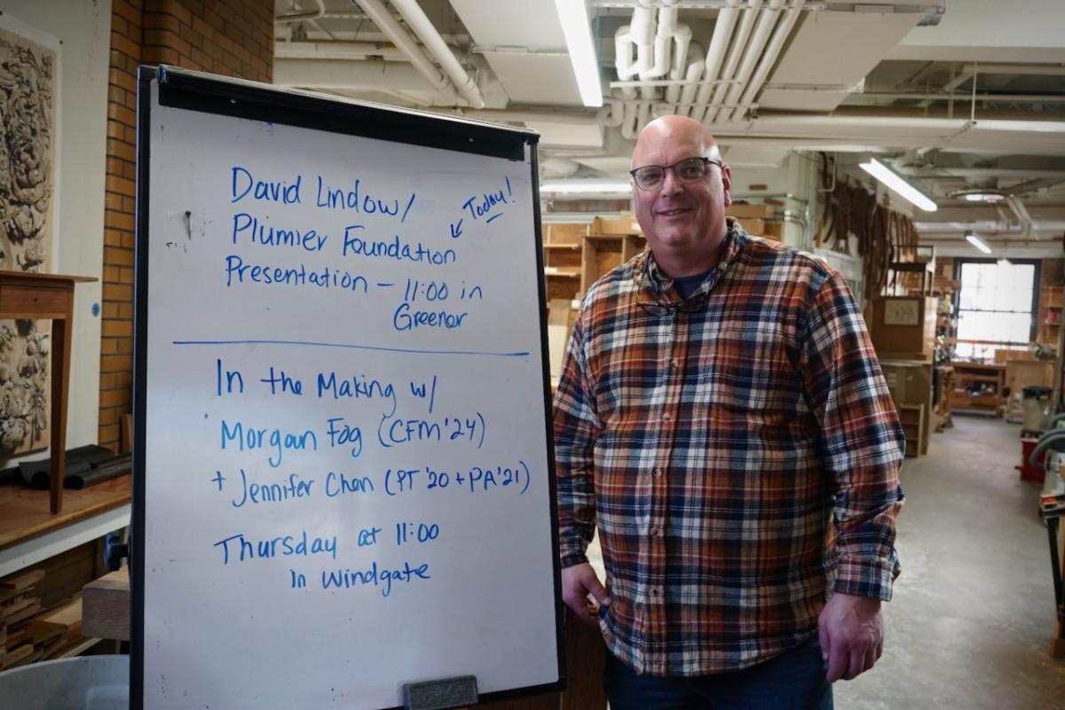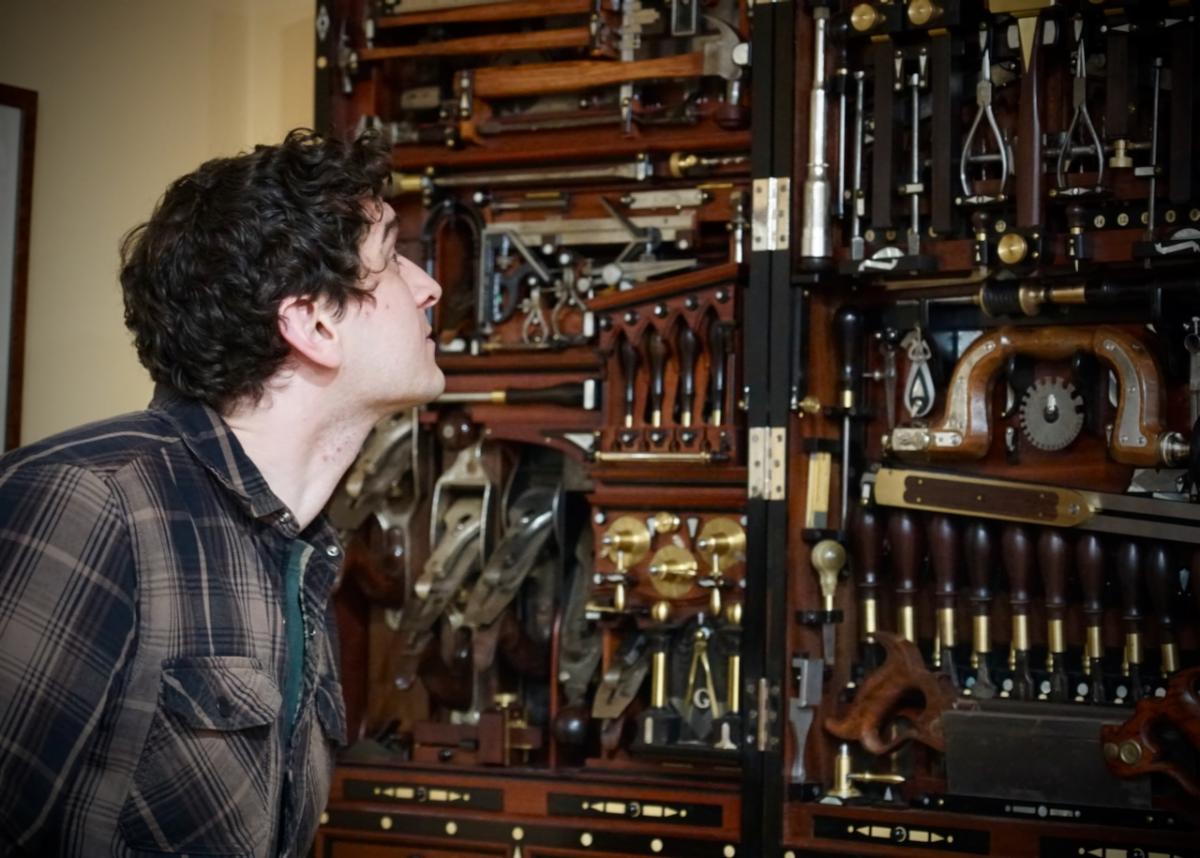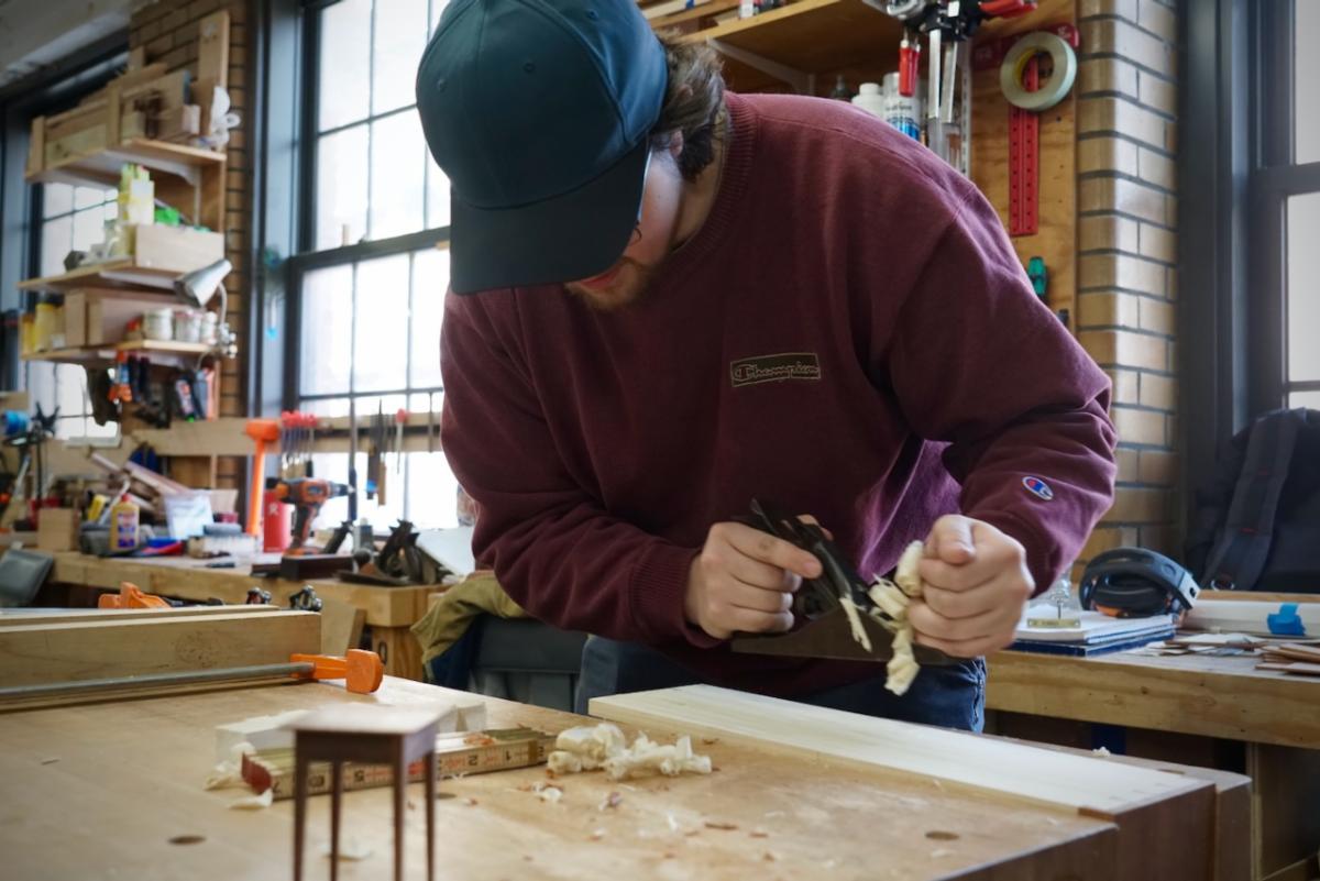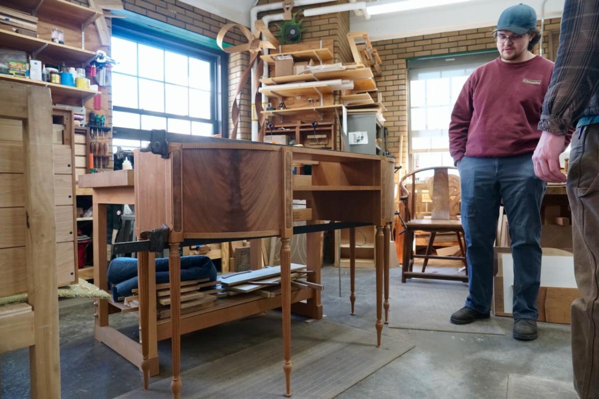 | | | | After the presentation, the Plumier team was given a tour of the facility. North Bennet Street School covers 8 disciplines: bookbinding, cabinet and furniture making, carpentry, jewelry making and repair, locksmithing and security technology, piano technology, preservation carpentry, and violin making and repair. All of these programs stand out in their quality, and several are the last full-time programs of their kind in the country. The facilities and work of the students displayed throughout are nothing but impressive. The Plumier Foundation looks forward to more opportunities to partner with NBSS in our shared mission of preserving skills and supporting careers in lost craft. | | David last presented at NBSS in the fall of 2024. In the audience that day was future Plumier Intern Zach Reynolds. Zach is now in his last semester of the two-year cabinet and furniture making program. Naturally, we stopped by Zach’s workbench to see what he has been working on. | |