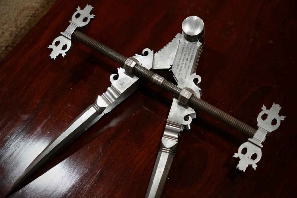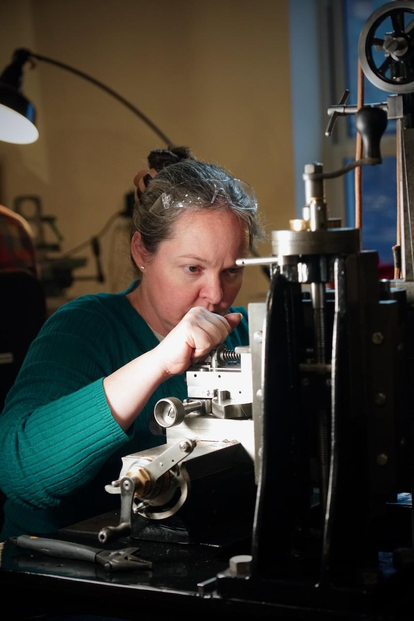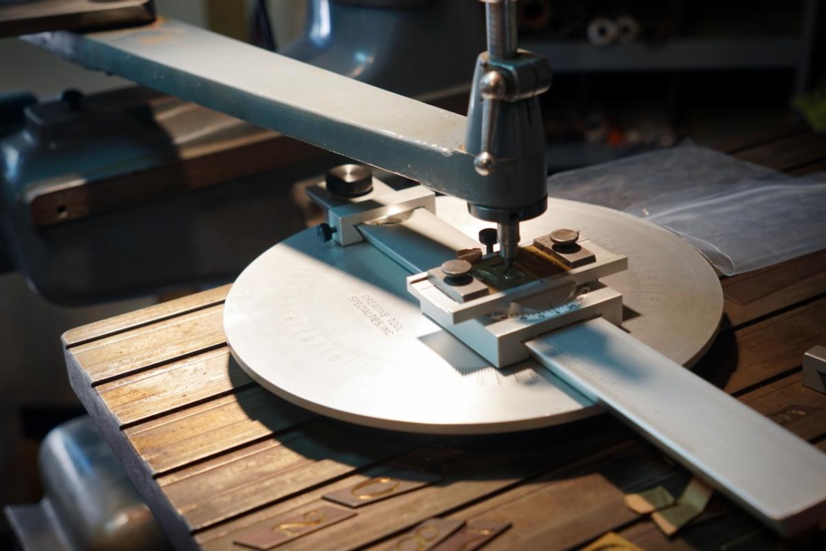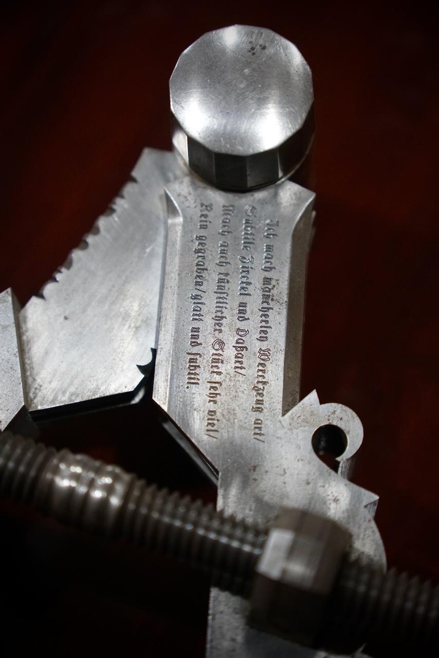 The inscription on the dividers is an excerpt from an early writing on toolmaking by the German poet and scholar Hans Sachs in 1568. It was engraved using Ogden’s Kuhlmann Pantograph, the same pantograph in the Plumier workshop that we just used in our class. The verse translates to this: