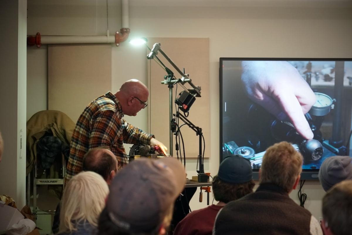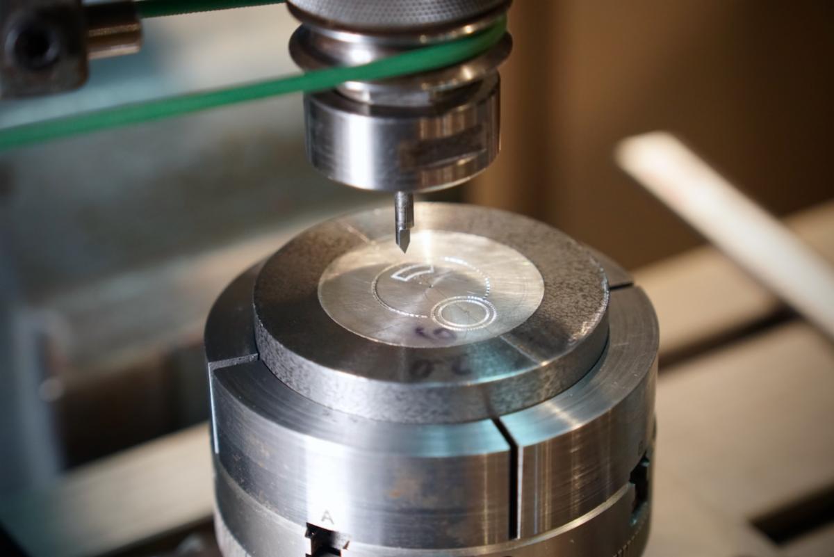 Winter weather couldn’t slow down activity at the Plumier Foundation in January. | | We held an experimental workshop on the design, setup, layout, and eventual engine turning of watch dials this month with the aim of developing a curriculum. The five-day class focused heavily on all the work that needs to be done before a single squiggly line can be cut in a rose engine or straightline pattern. | | Our students (or test subjects) began by machining their own “wax” chucks to hold the dial precisely. The tolerances of a watch dial required this fixture to be machined out of a rough puck of cast iron with a tolerances between the front and back faces of two tenths of a thousandth of an inch (+/- 0.0002”). A pocket was then bored out on the face with just a few thou of play to receive the dial blank, with grooves cut into the base of the recess to give a strong “key” for our wax of choice, superglue, to properly bond to. The blanks can then be faced off perfectly flat in the chuck, and work on the dial can begin. | | | | | Students designed their dials using a selection of large printouts of classic watch designs. Each feature on the large dials were carefully measured and scaled down using simple ratios. Each student made a full, detailed drawing of their dial with dimensions, locations, and angles of each featured carefully recorded. | | Work then moved to the milling machines, where the students dialed in a rotary table with a two axis slide and indexing plate mounted on top. Once the whole stack was dialed in to the spindle of the mill using test indicators, it could be used to mill out pockets for the subdials. | We then held a crash course in cutter geometry and grinding, arguably the most crucial skillset for successful engine turning. Each student ground their own brazed carbide tools including a flat tip cutter with a .050” width for chisel work, low angle points for engine turning patterns, and tiny radius cutters for line work on the rose engine. Any effort in engine turning without the ability to create and sharpen the whole range of custom cutting tools required will be quickly frustrated. | | | The cutters were put to the test adding chisel-cut borders to the watch dials using low amplitude pumping rosettes on the Lindow Rose Engine. Further layout lines, numbers, and signatures were added using the Kulhmann pantograph with a dial layout jig. Some students also used the LRE elliptical chuck to create elliptical windows on their dials for their signatures. | | | Finally, it was time for some engine turning. Patterns were added to the dials using LREs and Plant straightline engines. Students experimented with both machines, learning different patterns and an understanding of the capabilities of each. A few also set up the straightline attachment on the LRE to better match their home shop capabilities. | | Most of the actual engine turning wasn’t done until Thursday and Friday, demonstrating how much time the setup work really takes and how crucial it is for success. We were very impressed by how well the students did. These were not simple setups, and most of the students had little experience in this kind of machine work prior to the class. With this success, we look forward to offering similar opportunities in the future. | | Watchmakers Michal and Vern Blaszczyk and their son Zack, a watchmaker in training, took the class together. The Blaszczyks own and operate House of Time watch repair in Gainesville, Florida. | | In preparation for this workshop, David Lindow brought his own Plant straightline engine to the shop and restored it to working order. The machine had been poorly stored before coming to David and needed to be completely taken apart, cleaned, painted, reassembled, and tuned. Member Neil Johnson, coming to the end of his extended stay at Plumier, stepped up to help as the deadline rapidly approached. While they couldn’t remove the pitting, the low spots do not affect the operation of the machine, which is running beautifully. It looks great in the shop next to its sibling from the Peter Gerstel Collection. | | | Before Neil left for home, he and David also made a clever threading tool that can be used to thread ornamental box components on just about any lathe with a carriage or compound. It is designed to mount to the tool post and hold the work piece while a threadmill is held in the spindle. The thread of the 16 TPI lead screw is copied onto the workpiece with steady turning of the hand wheel. It even has a simple double nut design to take up the backlash in the leadscrew. | | | Like the rest of the eastern half of the continental US, Saltsburg was not spared the harsh winter weather this month. After a week of single digit temperatures, the winter storm hit just after class was dismissed and our students made it out of town. | | From the early morning of Sunday the 25th, to the late evening of Monday the 26th, Saltsburg received over a foot of snow. The area hadn’t experienced an accumulation like that in over a decade. Despite the atrophy in muscle memory, the town and the county handled the storm well. As we have consistently seen in our time in Saltsburg, just about everyone around is ready and eager to lend a hand to their neighbors. | | Delayed a day by the snow, the Plumier team packed up and followed the path of the storm and the wake of plows east to Boston. | | David had been invited to give a presentation to students at North Bennet Street School on complex turning and the Plumier Foundation. While he was invited by Jamey Pope, head of the cabinet and furniture making department, the presentation was open to the whole school. Despite being behind on the week due to two snow days, students and staff representing every discipline packed into the classroom, which quickly became standing room only. | | David took the students and faculty members through the history of complex turning from the renaissance to early 20th century industry